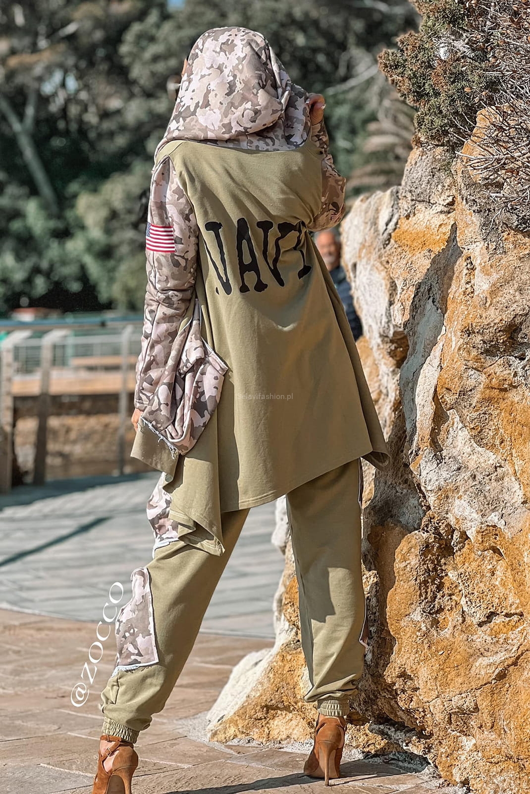 Długa bluza firmy Zocco utrzymana w stylistyce militarnej. Uszyta z materiału bawełnianego ozdobionego w charakterystyczne wstawki moro. Posiada kaptur i kieszenie typu kargo. Na plecach duży napis militarystyczny NAVY.