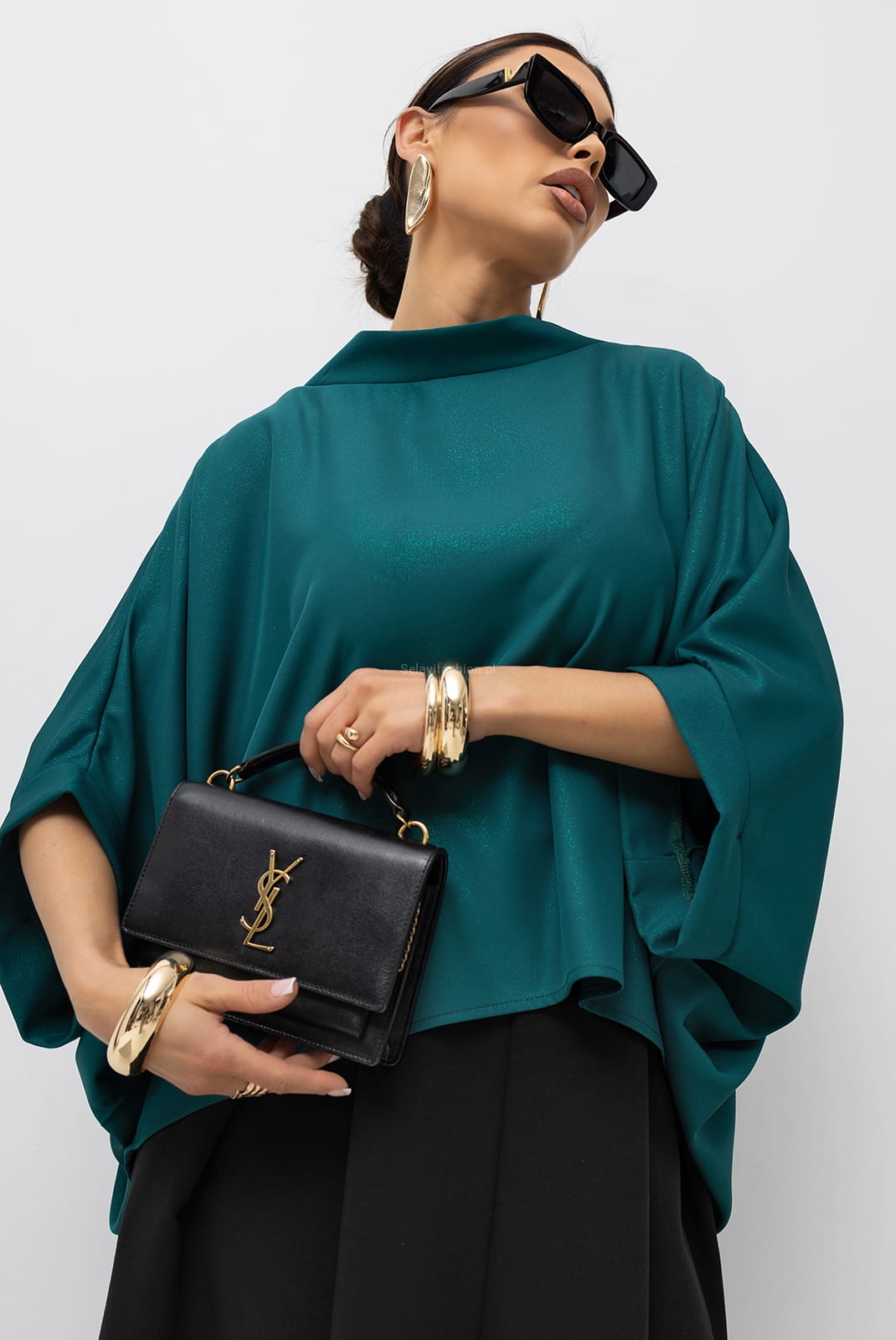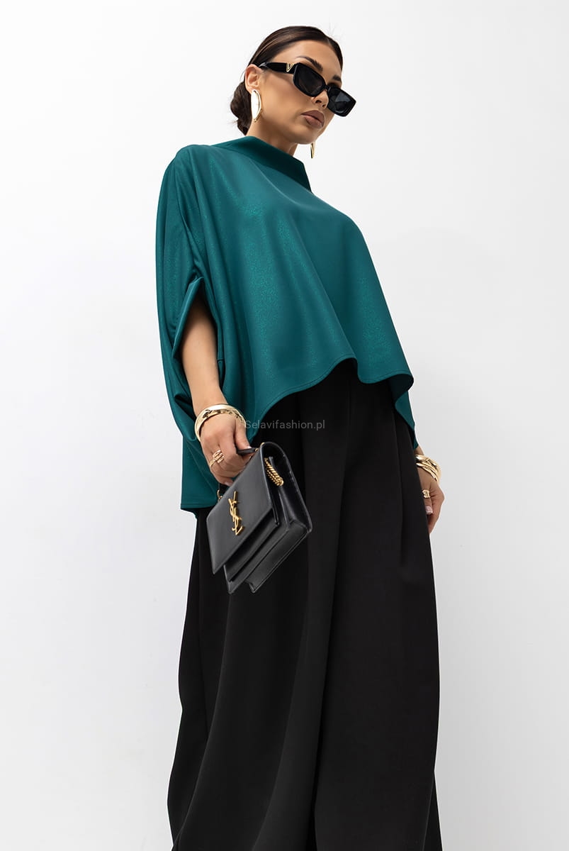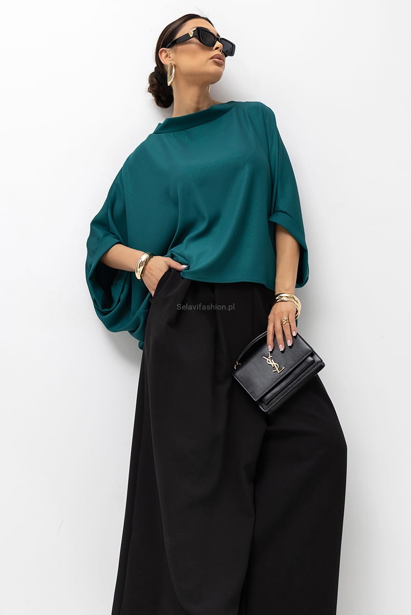 Bluzka oversize typu kimono z rękawem 3/4, uszyta z materiału z efektem błysku. Dekolt i rękawy wykończone zostały szeroką lamówką. Bluzka idealna zarówno do sportowych, jak i eleganckich stylizacji. Bluzka bardzo ładnie układa się i pasuje na każdą sylwetkę.