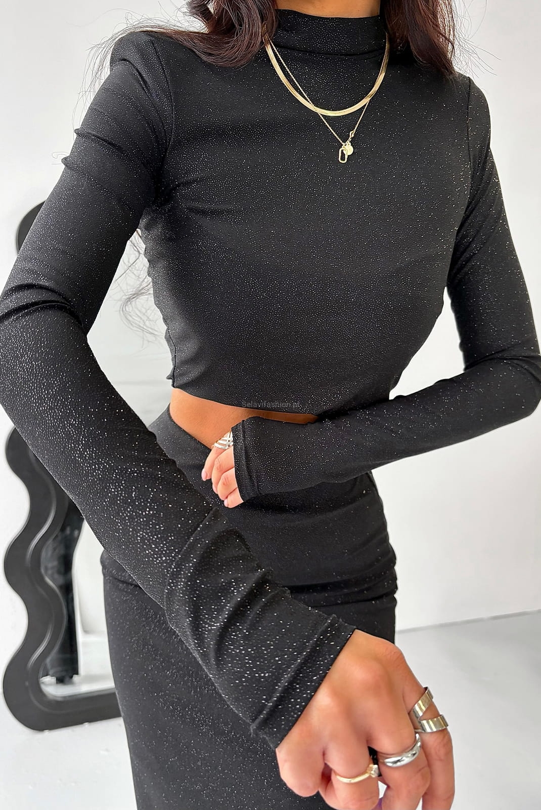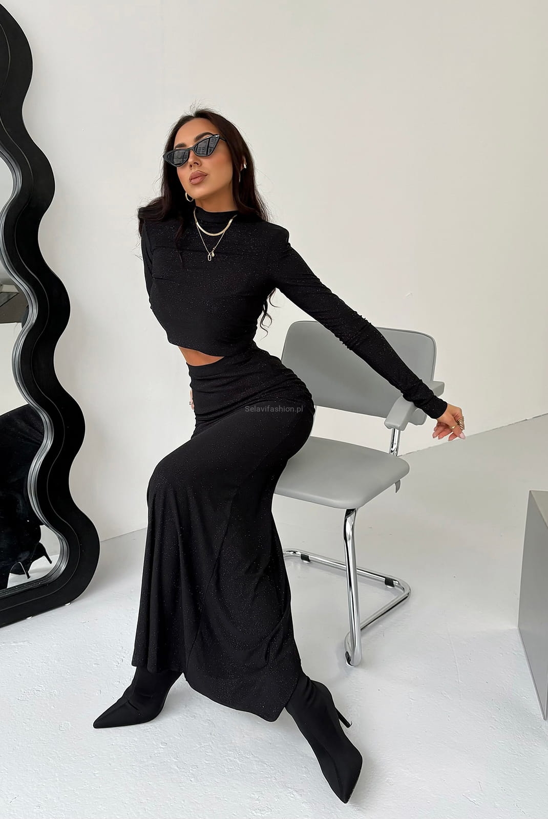 Bluzka z firmy LaMilla uszyta z materiału obsypanego brokatem. W ramionach poduszki.