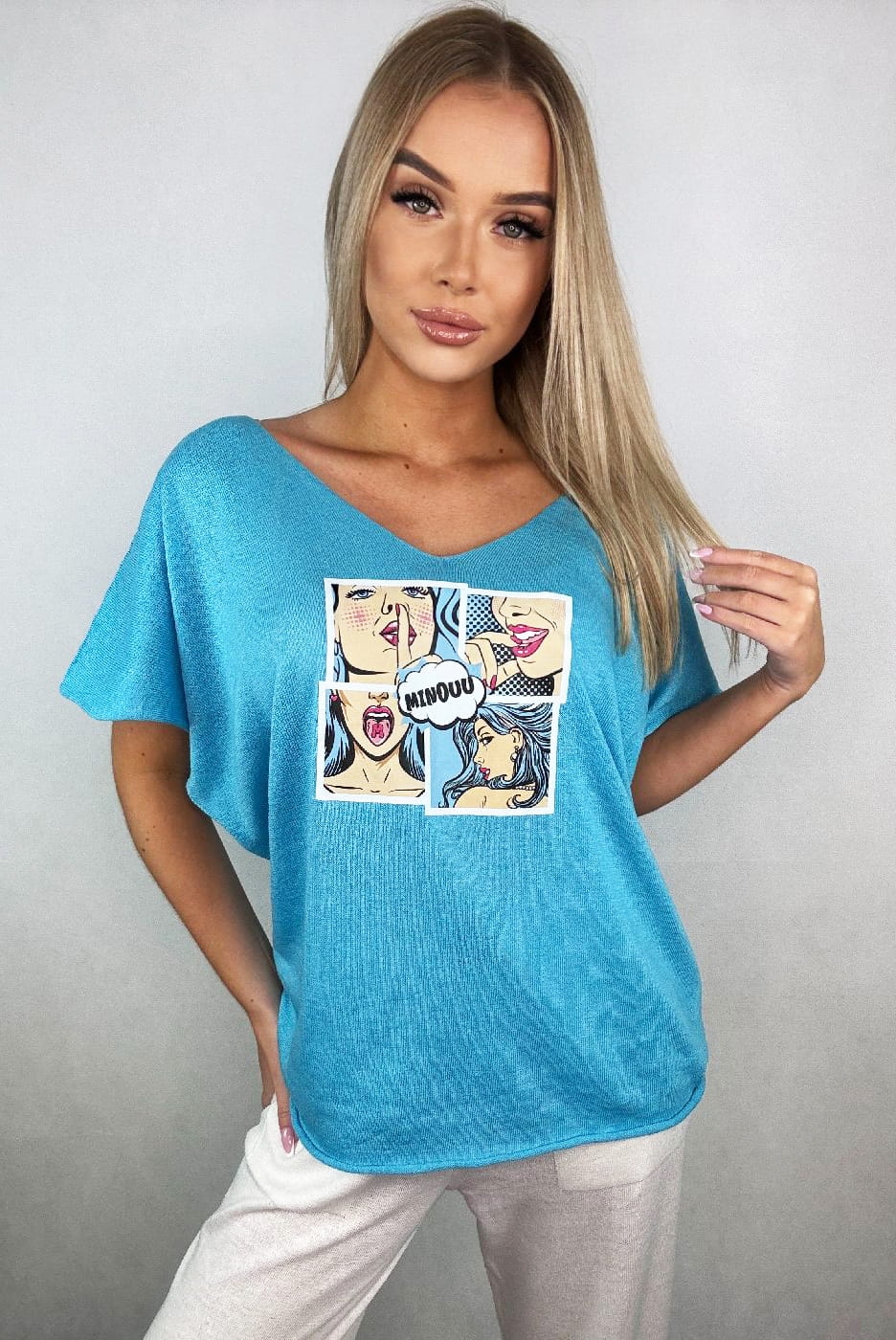 Bluzka swetrowa Komiks z krótkim rękawem Minouu niebieska