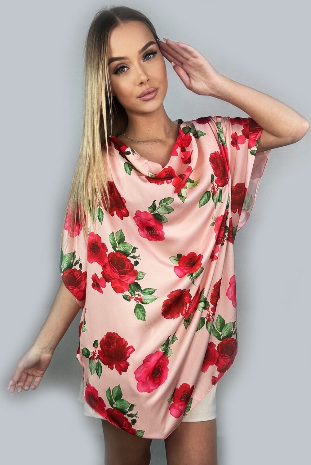 Bluzka, tunika w kwiaty z zaokrąglonym dołem i falbanką przy rękawie. Bluzka lejąca, bardzo ładnie układa się i pasuje na każdą sylwetkę.