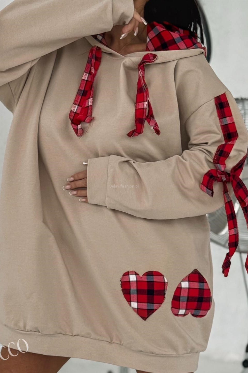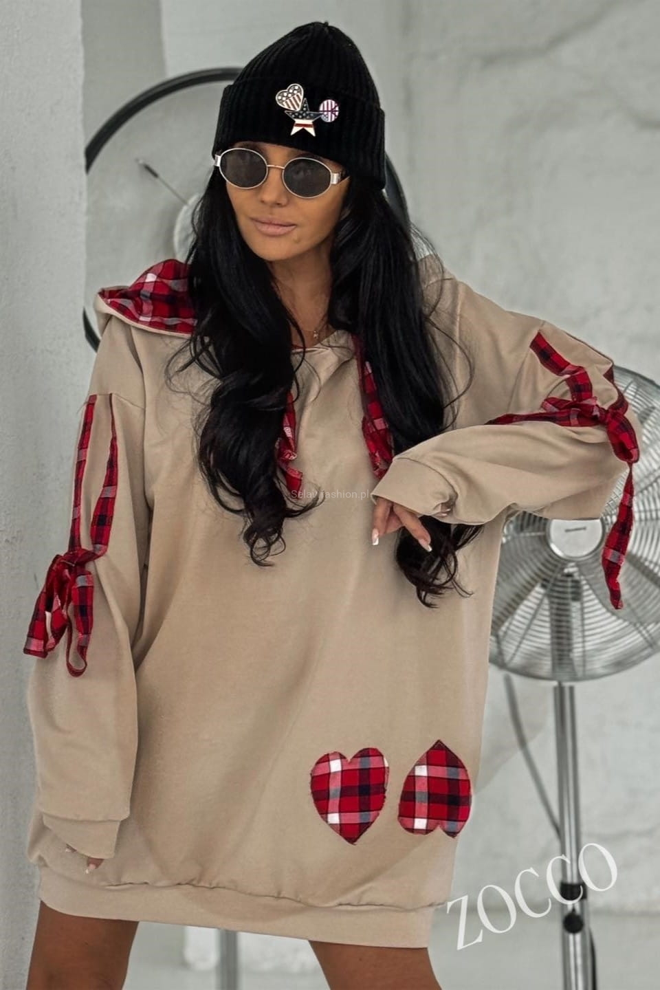 Dłuższa bluza od Zocco to wyjątkowy model, który łączy wygodę z efektownymi detalami. Ozdobiona została stylowymi wstawkami ze szkockiej kraty, które podkreślają kaptur oraz wykończenia rękawów. Uroku dodają jej dwa starannie doszyte serca, tworząc niepowtarzalny, charakterystyczny akcent.