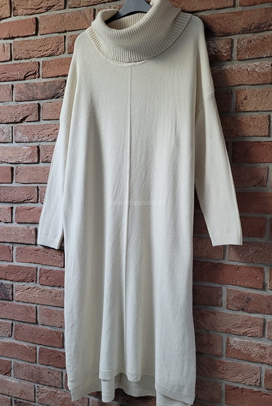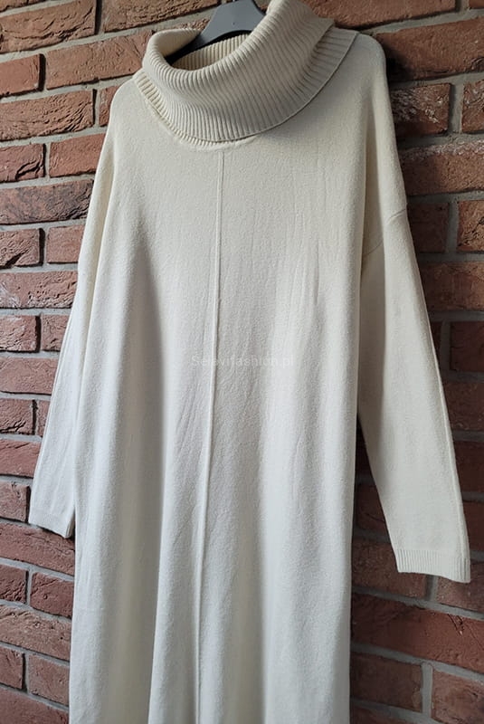 Długa dzianinowa sukienka z szalowym golfem Minouu ecru