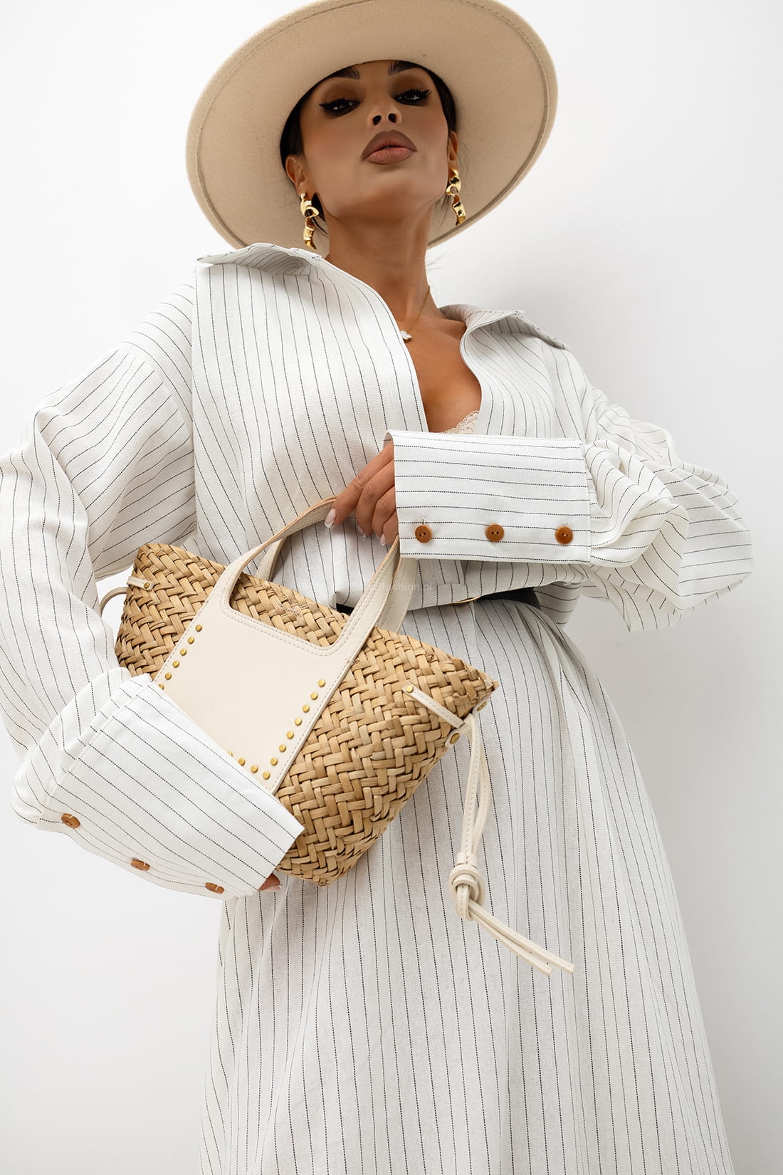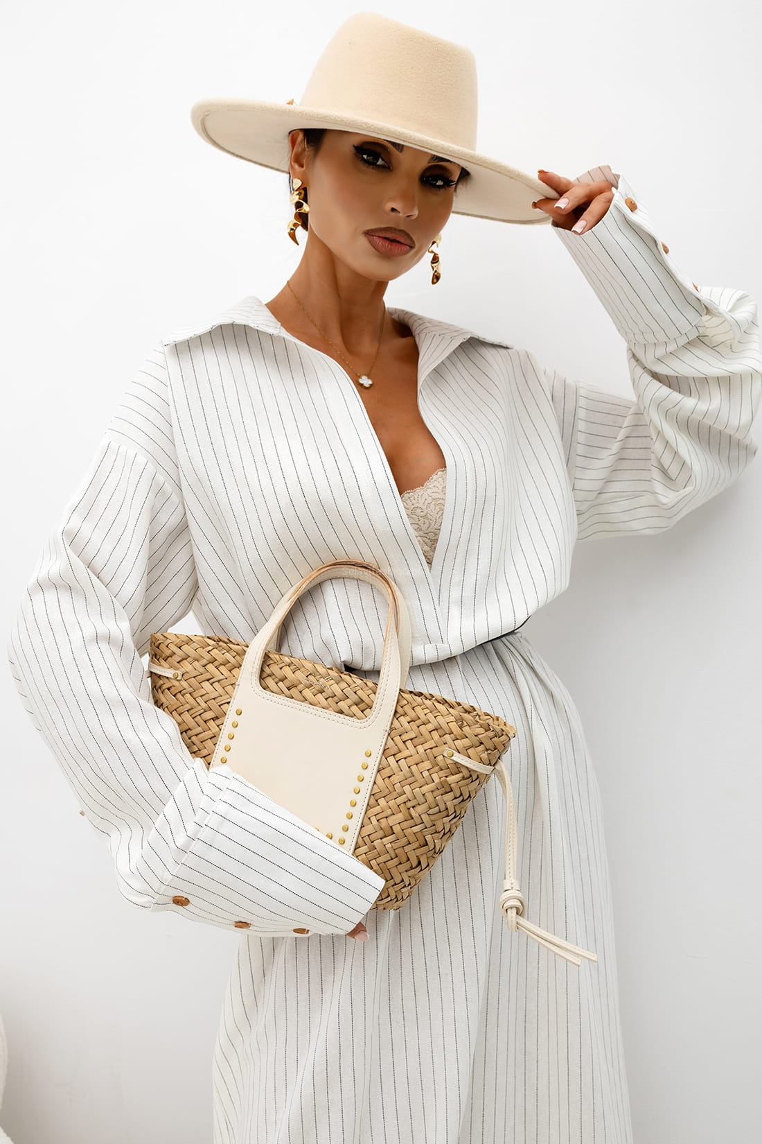 Sukienka koszulowa o luźnym, nowoczesnym kroju, wykonana z lekkiej i przyjemnej w dotyku tkaniny. Subtelny pionowy prążek optycznie wysmukla sylwetkę i nadaje całości eleganckiego charakteru.
