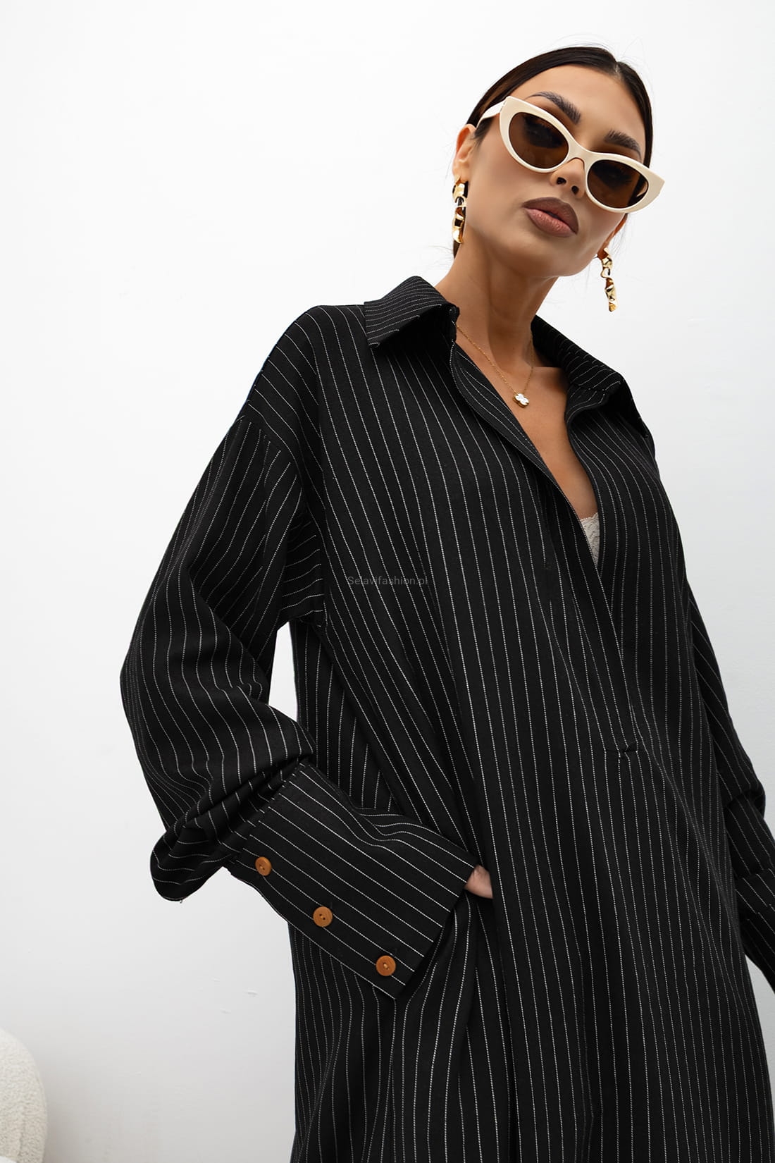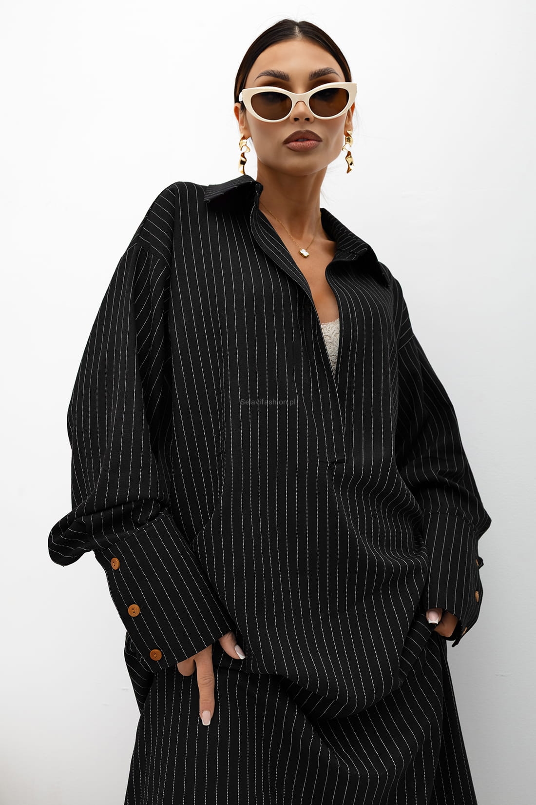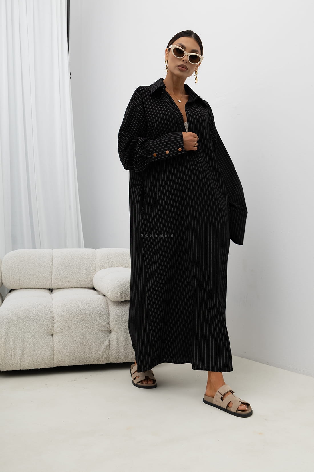 Sukienka koszulowa o luźnym, nowoczesnym kroju, wykonana z lekkiej i przyjemnej w dotyku tkaniny. Subtelny pionowy prążek optycznie wysmukla sylwetkę i nadaje całości eleganckiego charakteru.