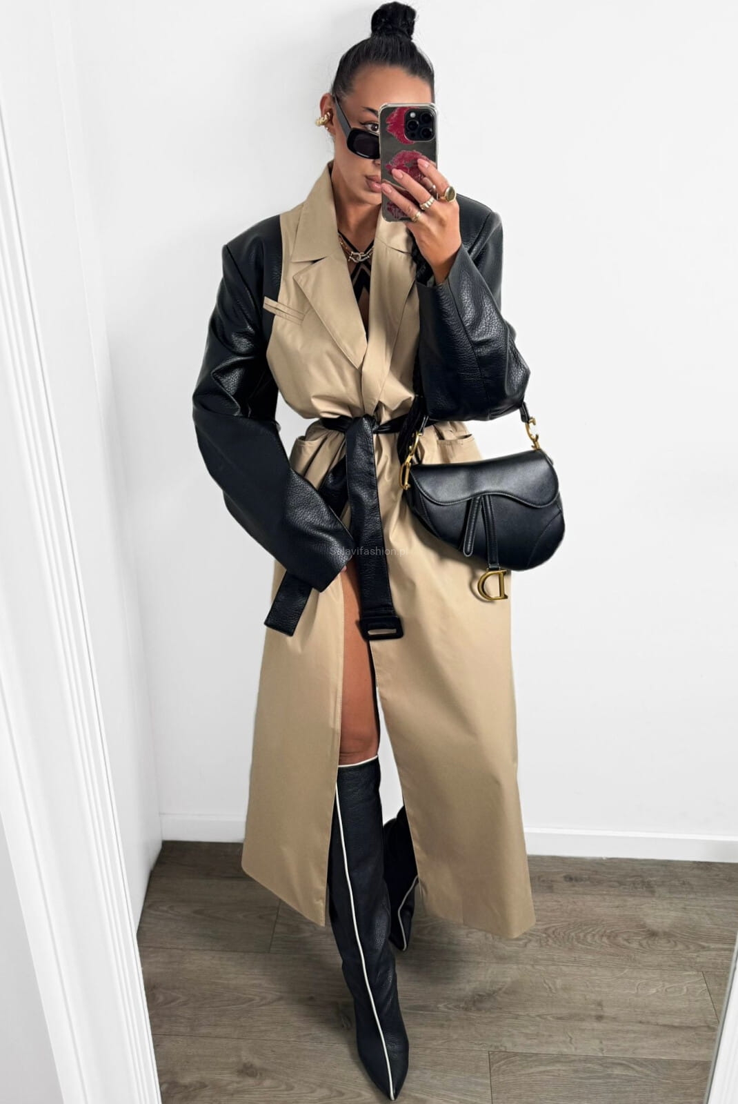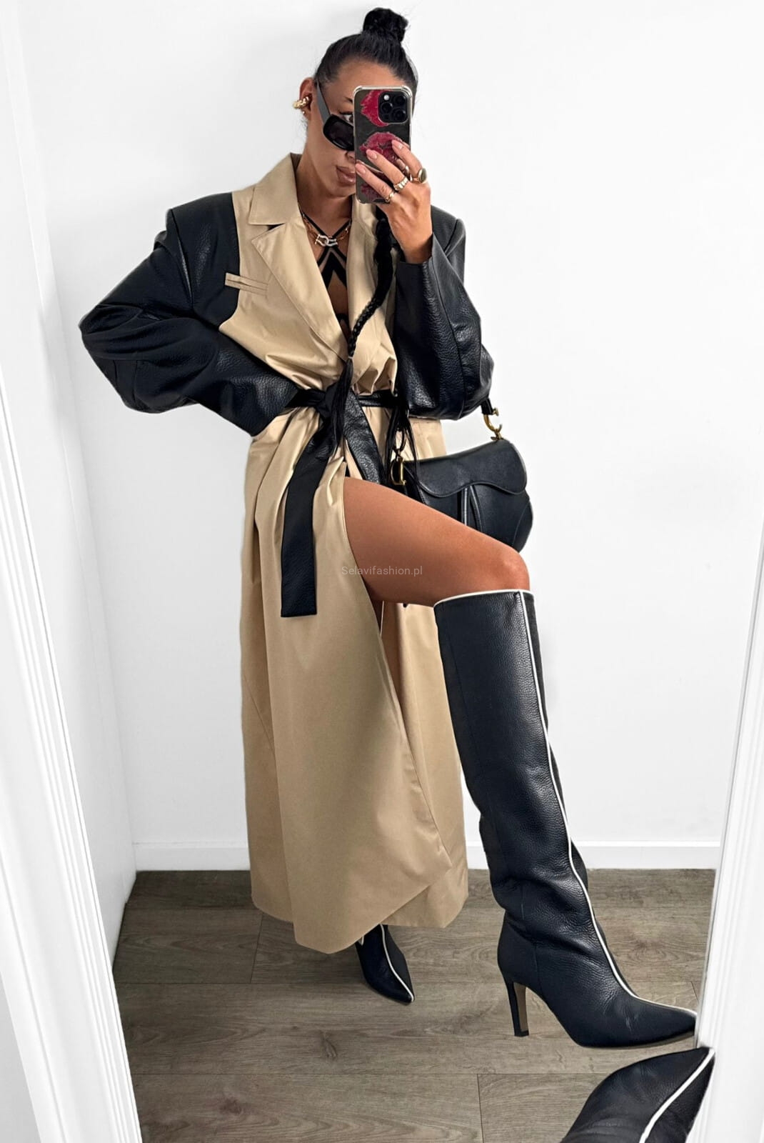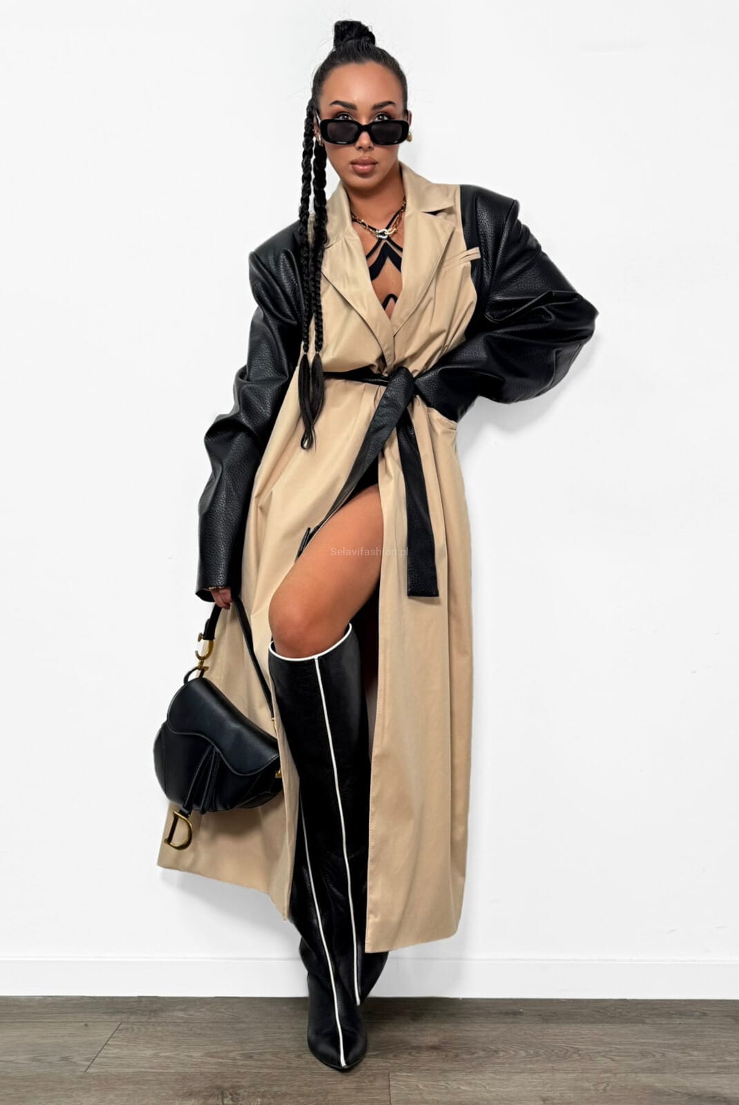Długi klasyczny płaszcz trencz z skórzanymi rękawami La Milla beżowy