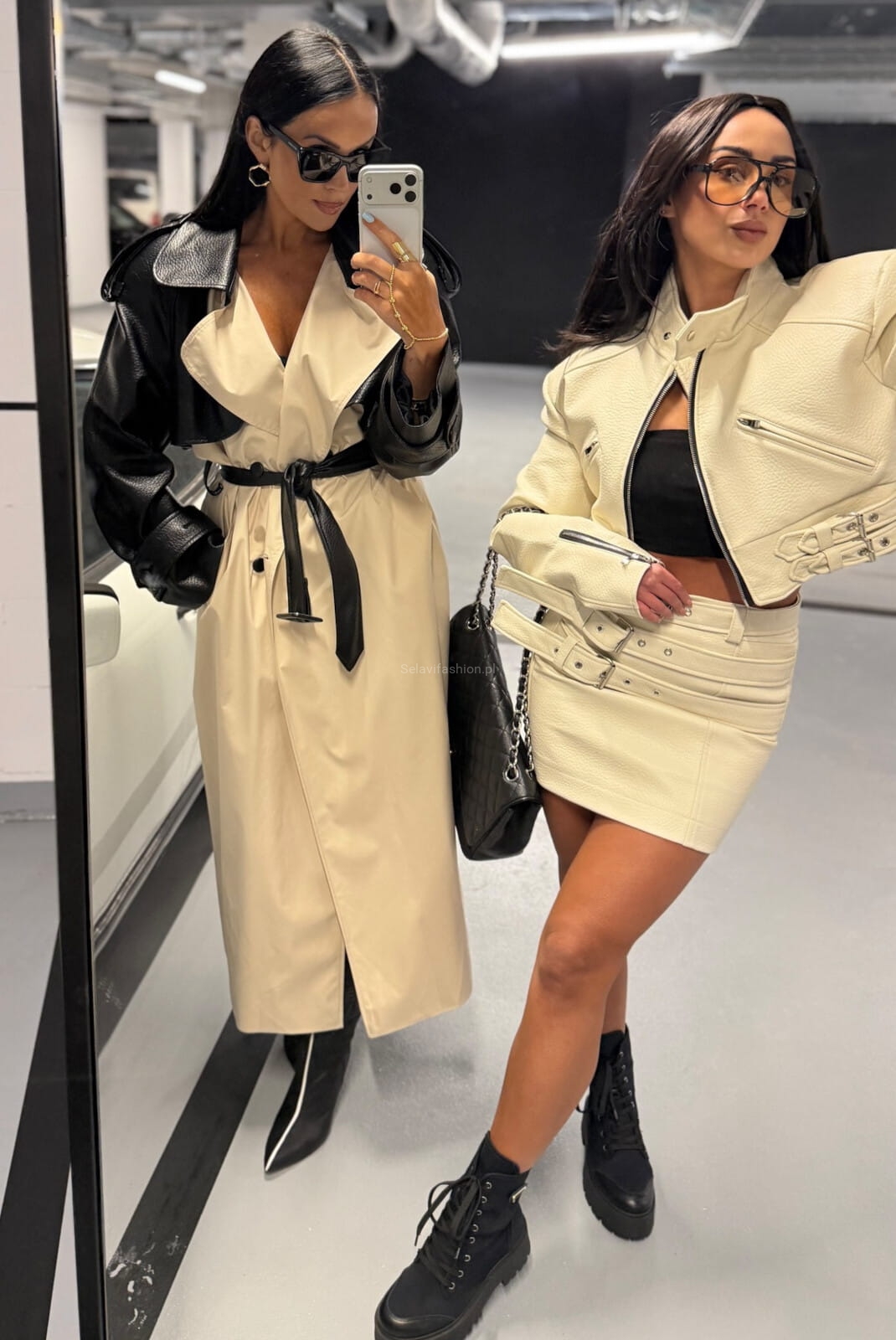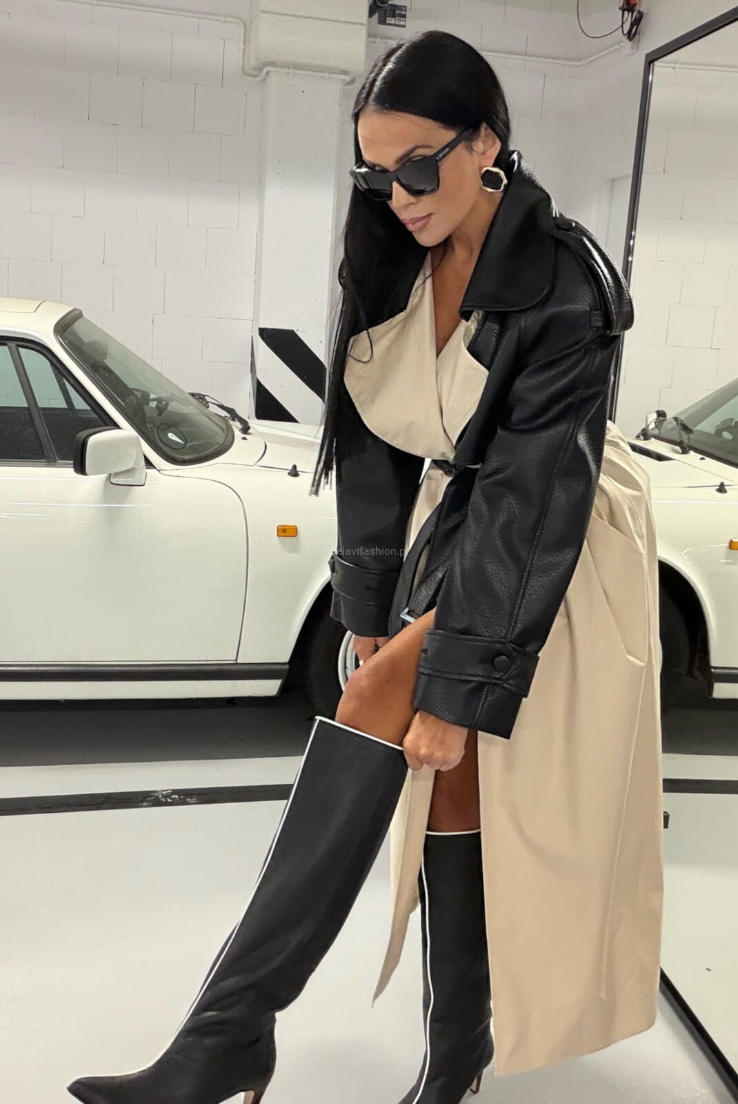 Długi klasyczny płaszcz trencz z skórzanymi rękawami La Milla kremowy
