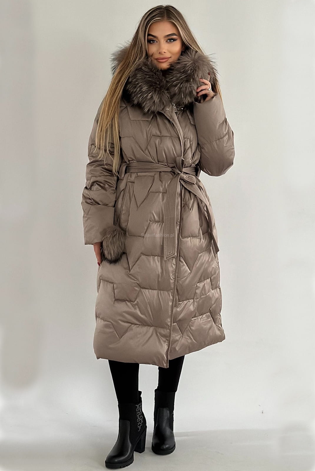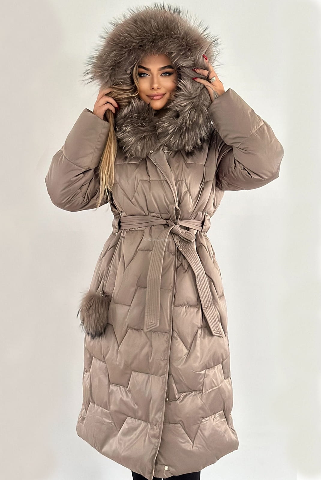 Długi płaszcz kurtka z kapturem i naturalnym futrem cappuccino