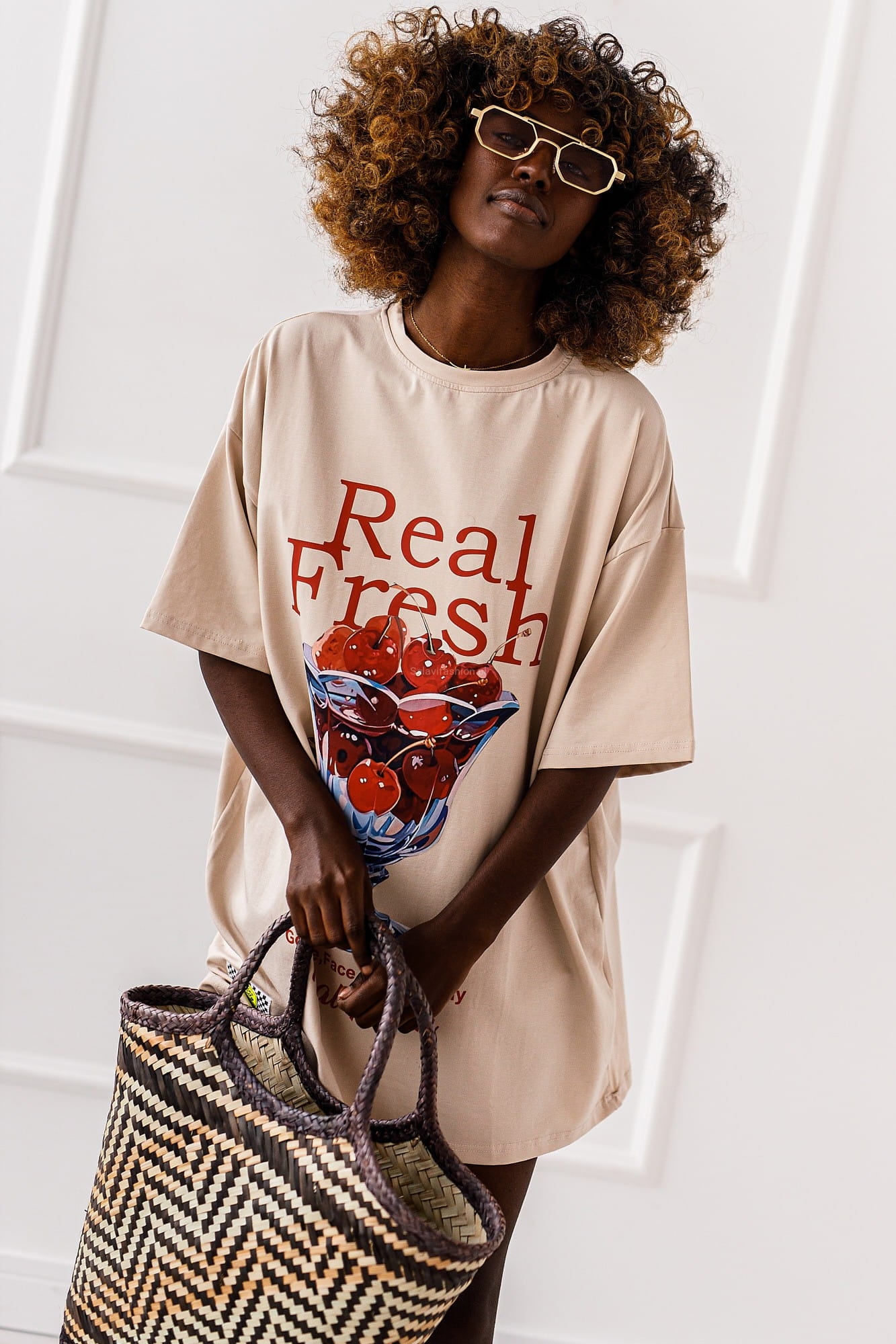 Długi t-shirt bluzka Wiśnie Miss City beżowa