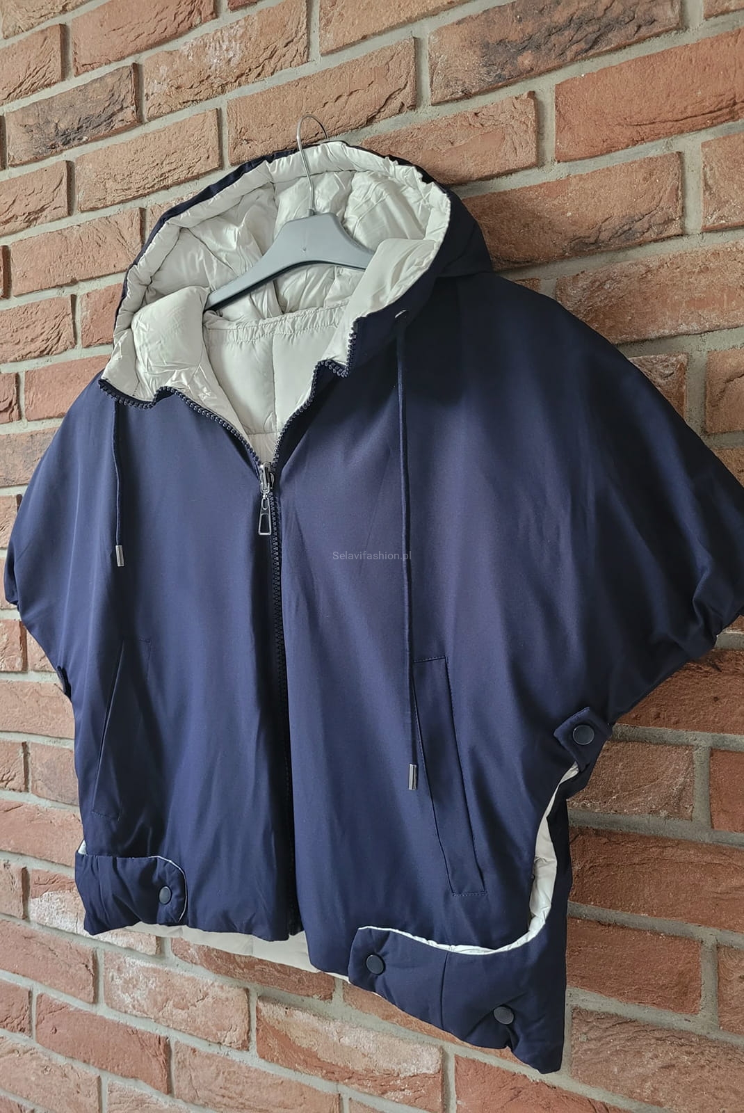 Dwustronna, geometryczna kamizelka od Minouu. Składa się z dwóch różnych stron: gładkiej i pikowanej. Kamizelka posiada rozcięte boki połączone napami i duży kaptur. Zapinana na plastikowy,ciepły zamek. Bardzo interesujący fason w rozmiarze uniwersalnym.