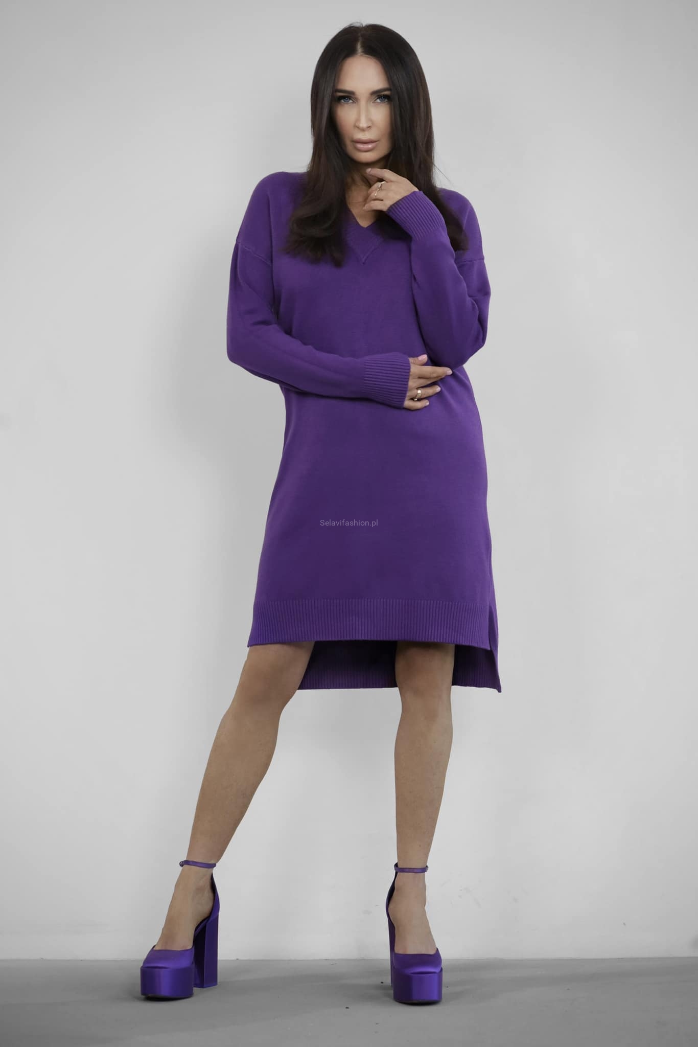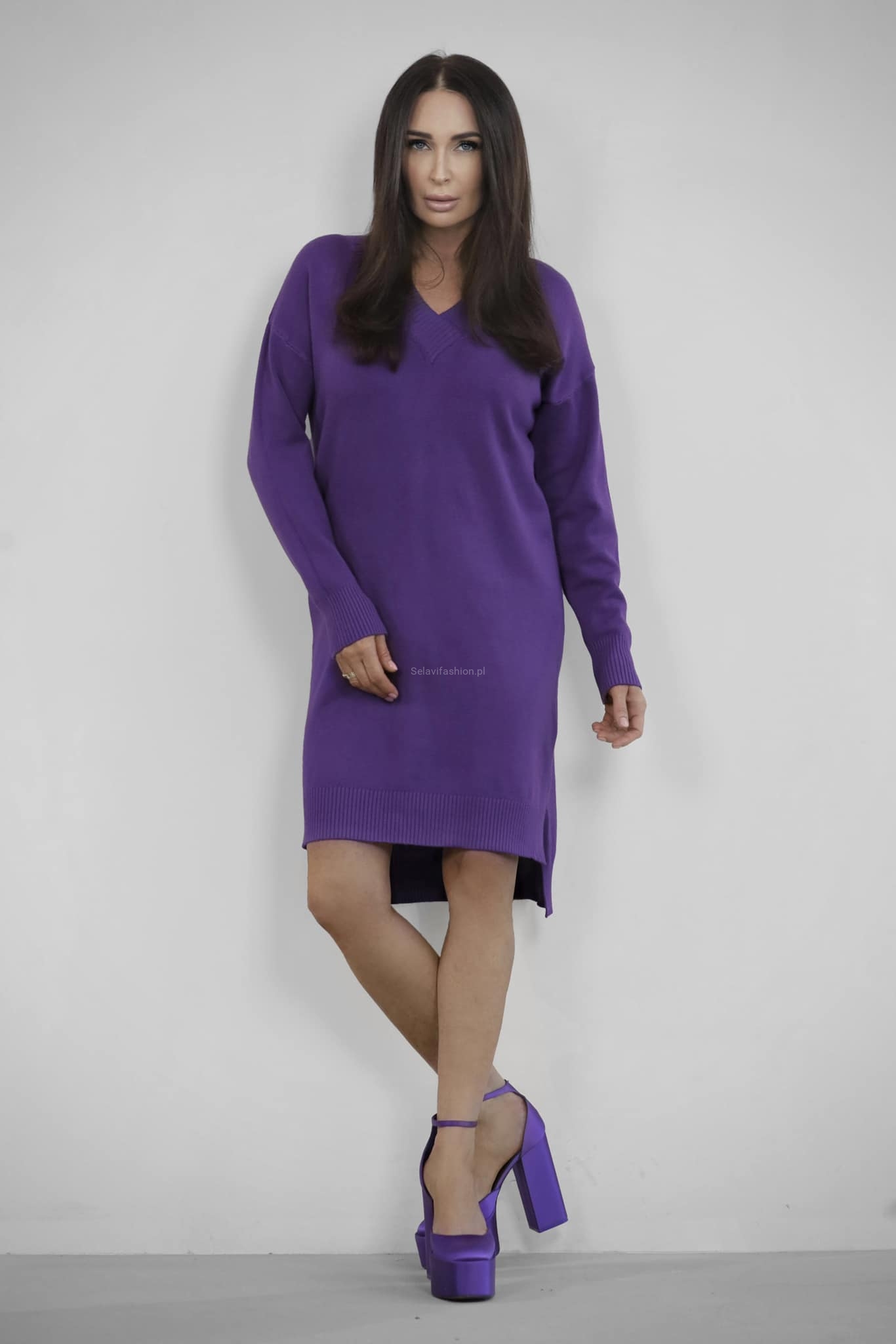 Dzianinowa sukienka z dekoltem w serek Minouu fioletowa