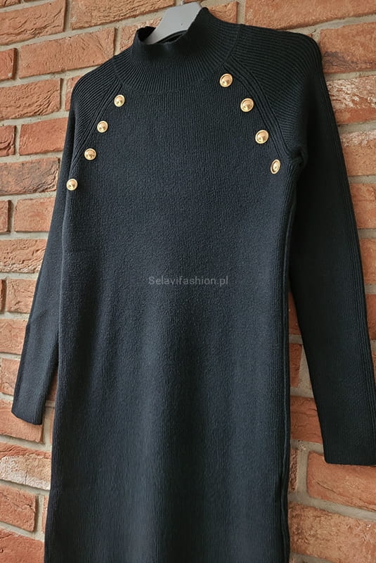 Długa asymetryczna sukienka od Minouu uszyta z jednolitego dzianinowego materiału. Sukienki ozdobiona doszytymi ozdobnymi napami.