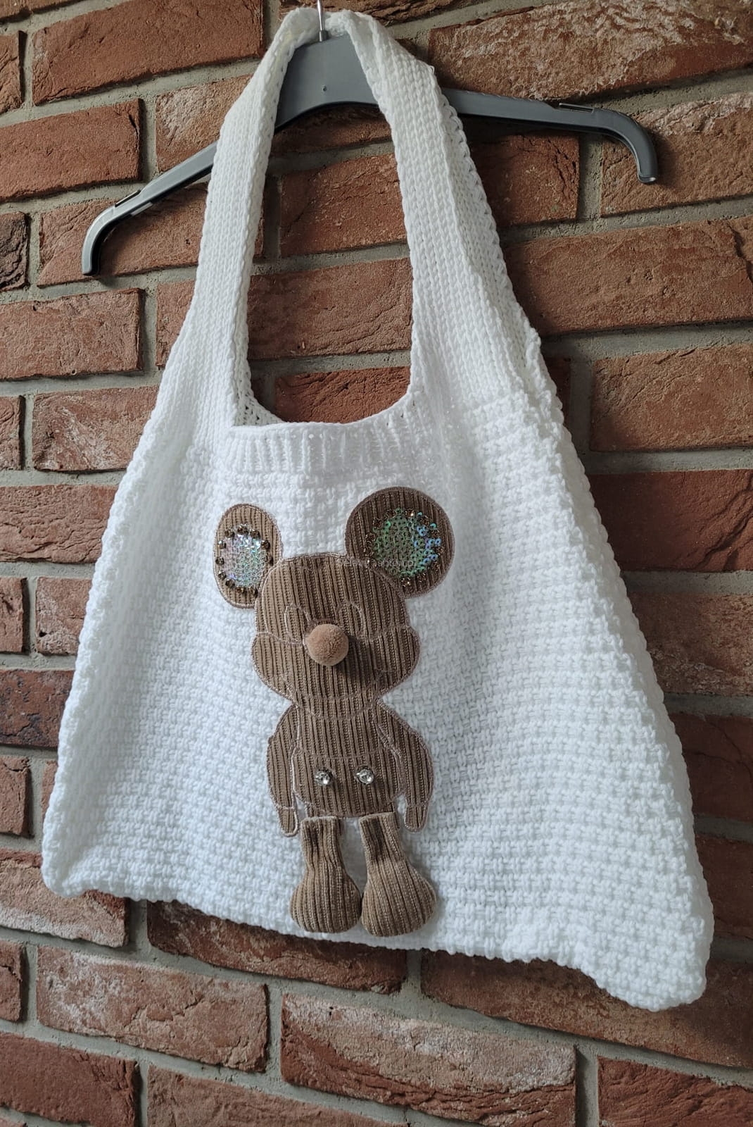 Torba dzianinowa firmy Minouu ozdobiona aplikacją.