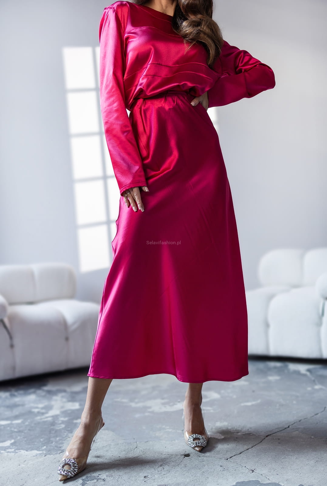 Elegancki satynowy komplet Silks bluzka i spódnica Miss City Official fuksja