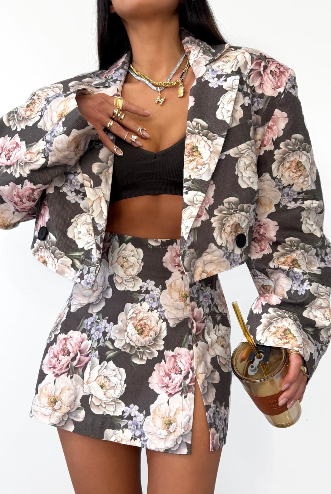 Komplet Marynarka i spódniczko spodenki w peonie LaMilla brązowy