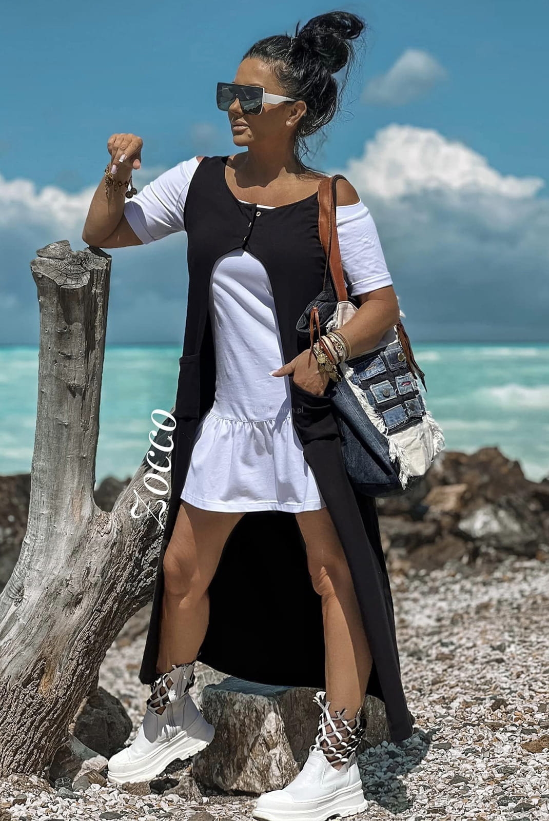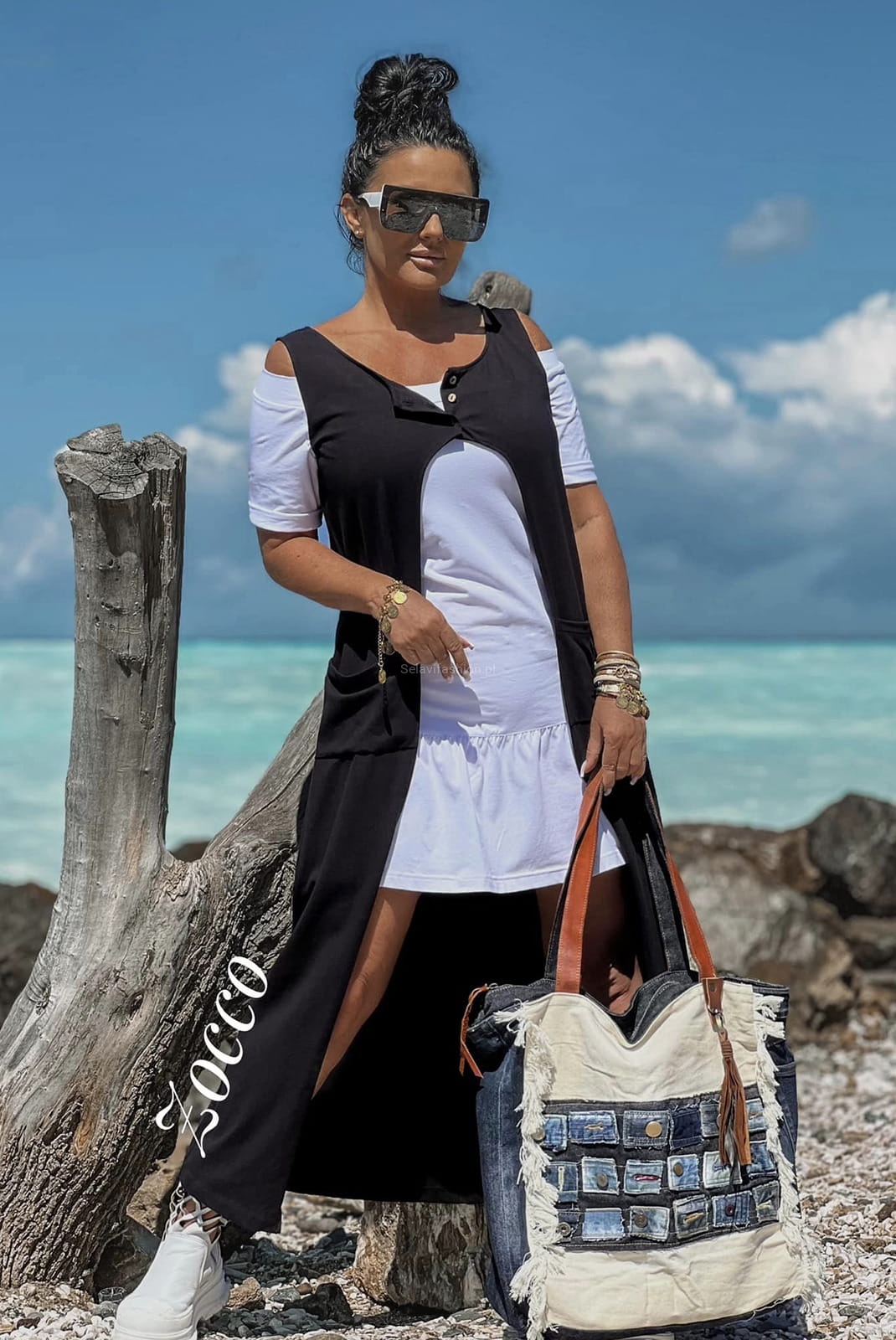 Komplet od Zocco składający się z białej tuniki zakończonej falbanką i długiej narzutki zapinanej na trzy guziki. Całość prezentuje bardzo oryginalnie.