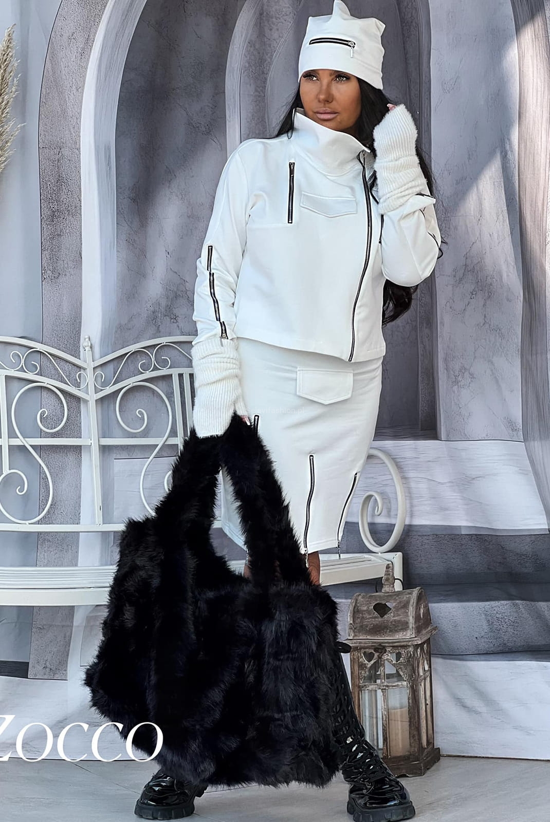 Trzy częściowy komplet od Zocco składający się bluzy zapinanej na zamek, spódniczki i czapki. Cały zestaw ozdobiony jest metalowymi suwakami i występuje w różnych wariantach kolorystycznych.