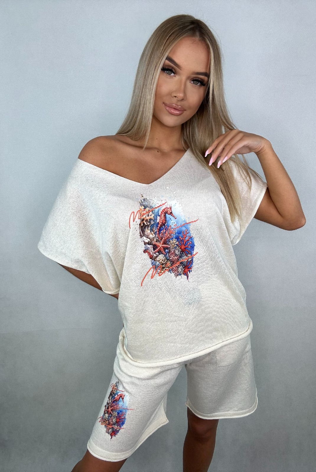 Komplet od Minouu składa się z bluzki i spodenek. Bluzka swetrowa posiada krótkie rękawy oraz dekolt w serek, z dodatkowymi rozcięciami na dole, które podkreślają sylwetkę.