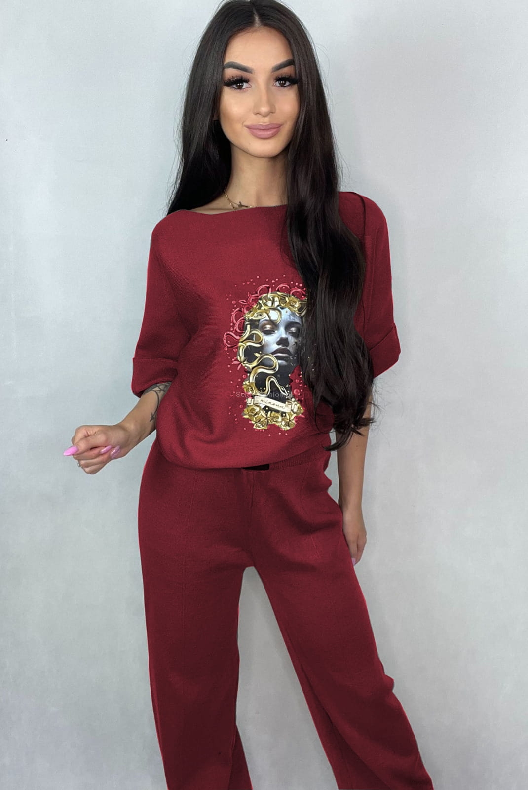 Komplet bluzka i spodnie z prostą nogawką Minouu bordowy