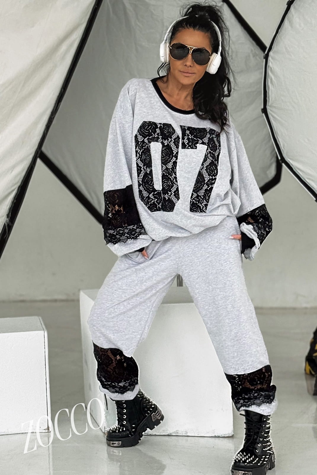 Komplet od firmy Zocco składający się z bluzy i spodni, wyróżniający się oryginalnym połączeniem sportowego stylu z kobiecymi akcentami. Zarówno bluza, jak i spodnie ozdobione są efektownymi wstawkami z koronki, które nadają całości wyjątkowego charakteru. Na plecach znajduje się ozdobne wyszycie z numerem „07”, podkreślające modny, sportowy ton zestawu.