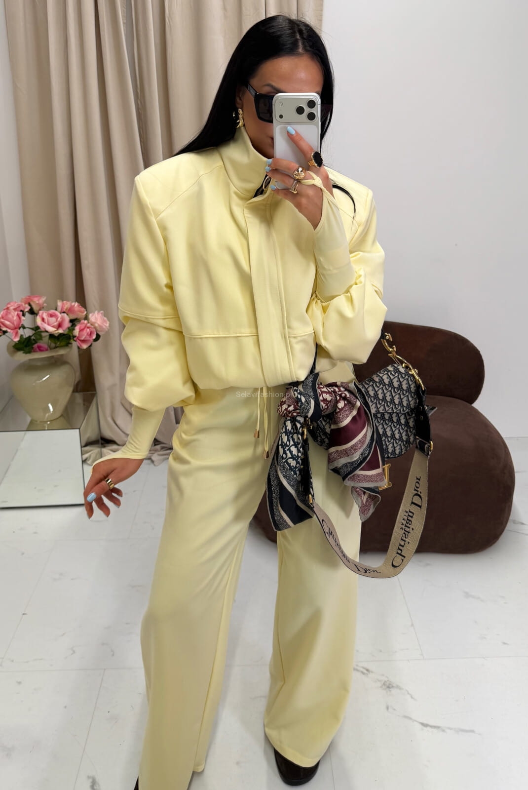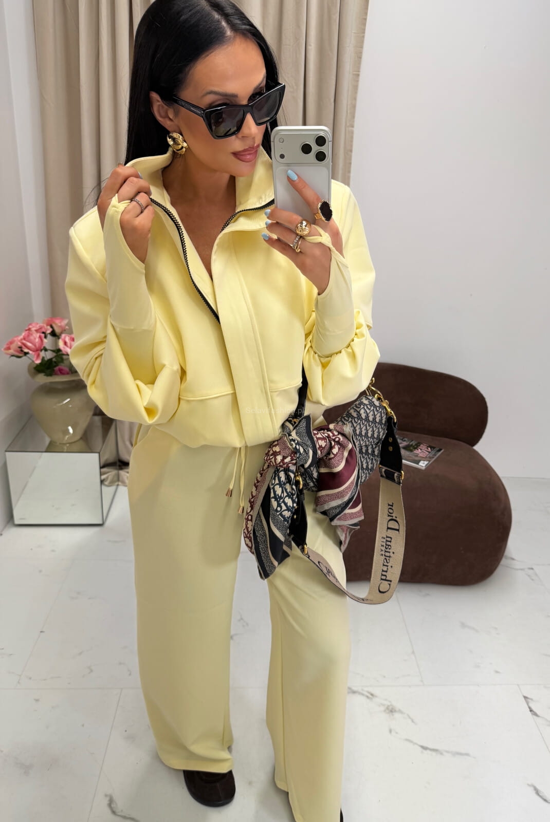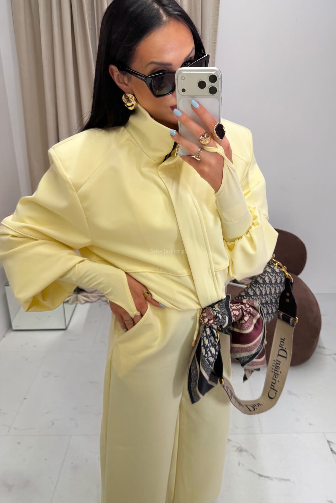 Bomberka o skróconym kroju podkreśla talię i nadaje sylwetce lekkości, natomiast szerokie spodnie zapewniają maksymalny komfort noszenia oraz swobodę ruchów. To komplet, który świetnie sprawdzi się zarówno na co dzień, jak i w bardziej stylizowanych outfitach.