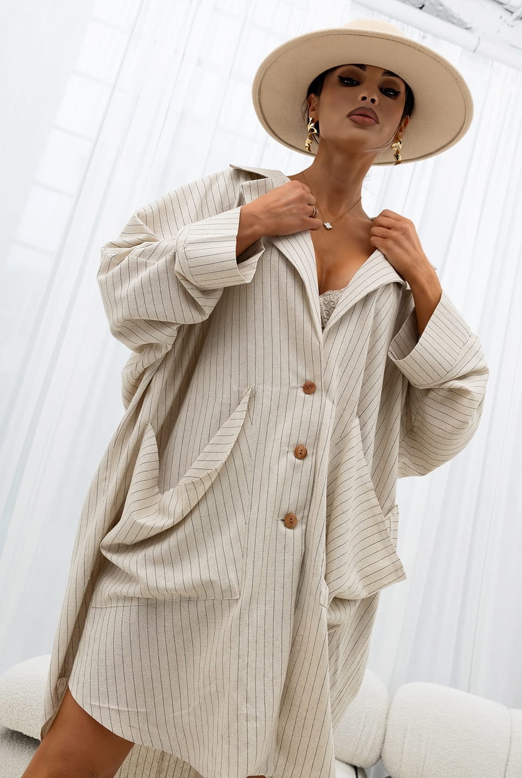 Koszula o nowoczesnym, oversize’owym kroju, która przyciąga uwagę swoim wyrazistym charakterem i modowym luzem. Wykonana z lekkiego, przyjemnego w dotyku materiału, delikatnie układa się na sylwetce, zapewniając komfort noszenia przez cały dzień. Subtelny prążkowany wzór nadaje jej eleganckiego, a jednocześnie niewymuszonego stylu.