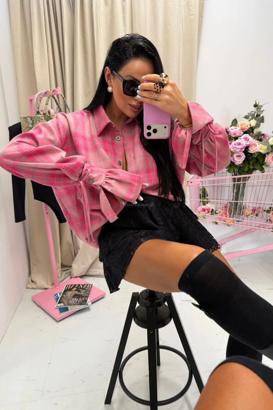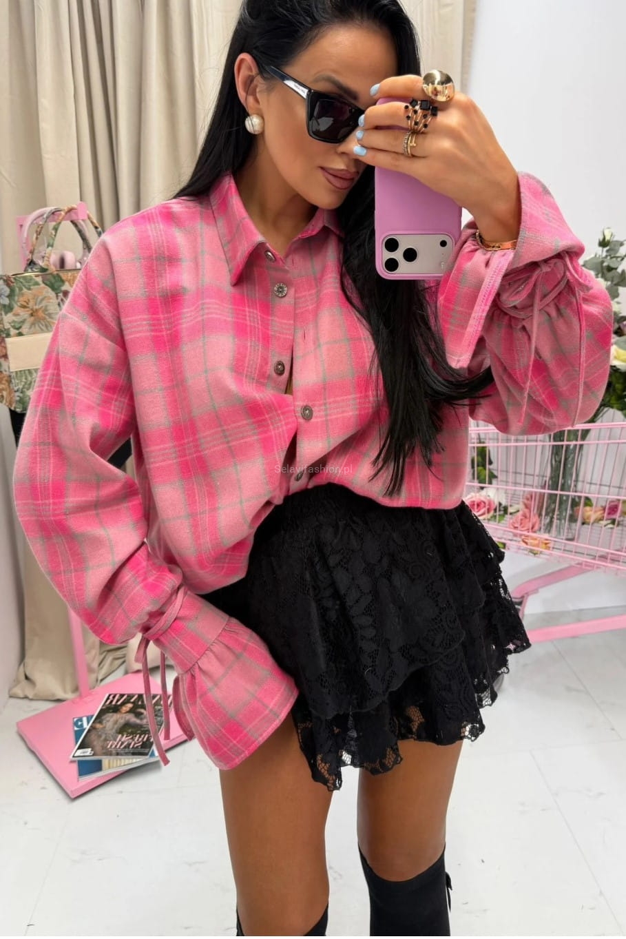 Koszula bawełniana w kratę z szerokimi mankietami La Milla różowa