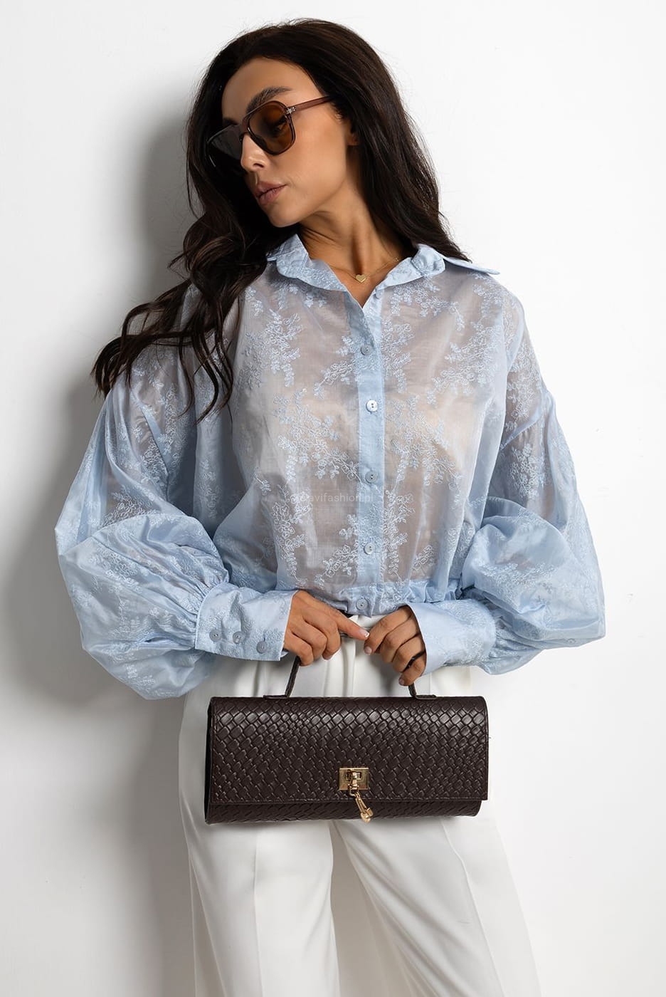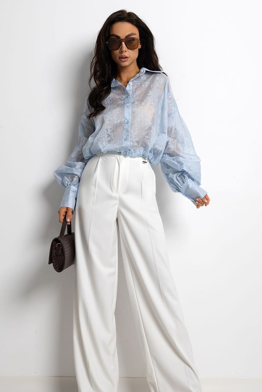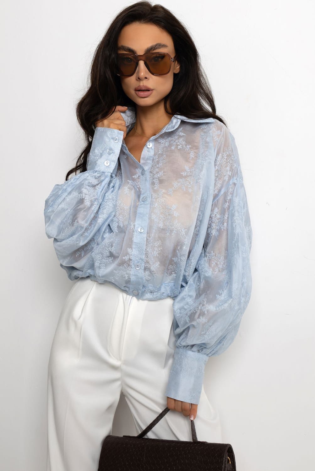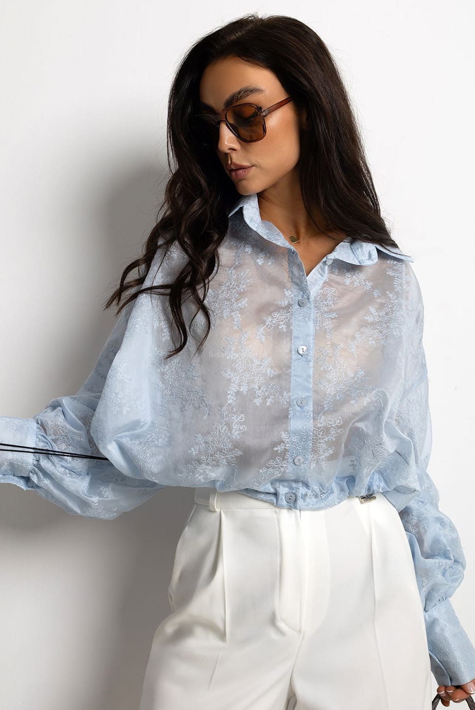 Koszula od Lavestino RICH. Bombkowy krój koszuli i marszczenie na rękawach wyróżniają i podkreślają jej fason, idealnie wpasowując się w stylizacje eleganckie z nutką ekstrawagancji. Materiał ozdobiony haftowanym wzorem kwiatowym.