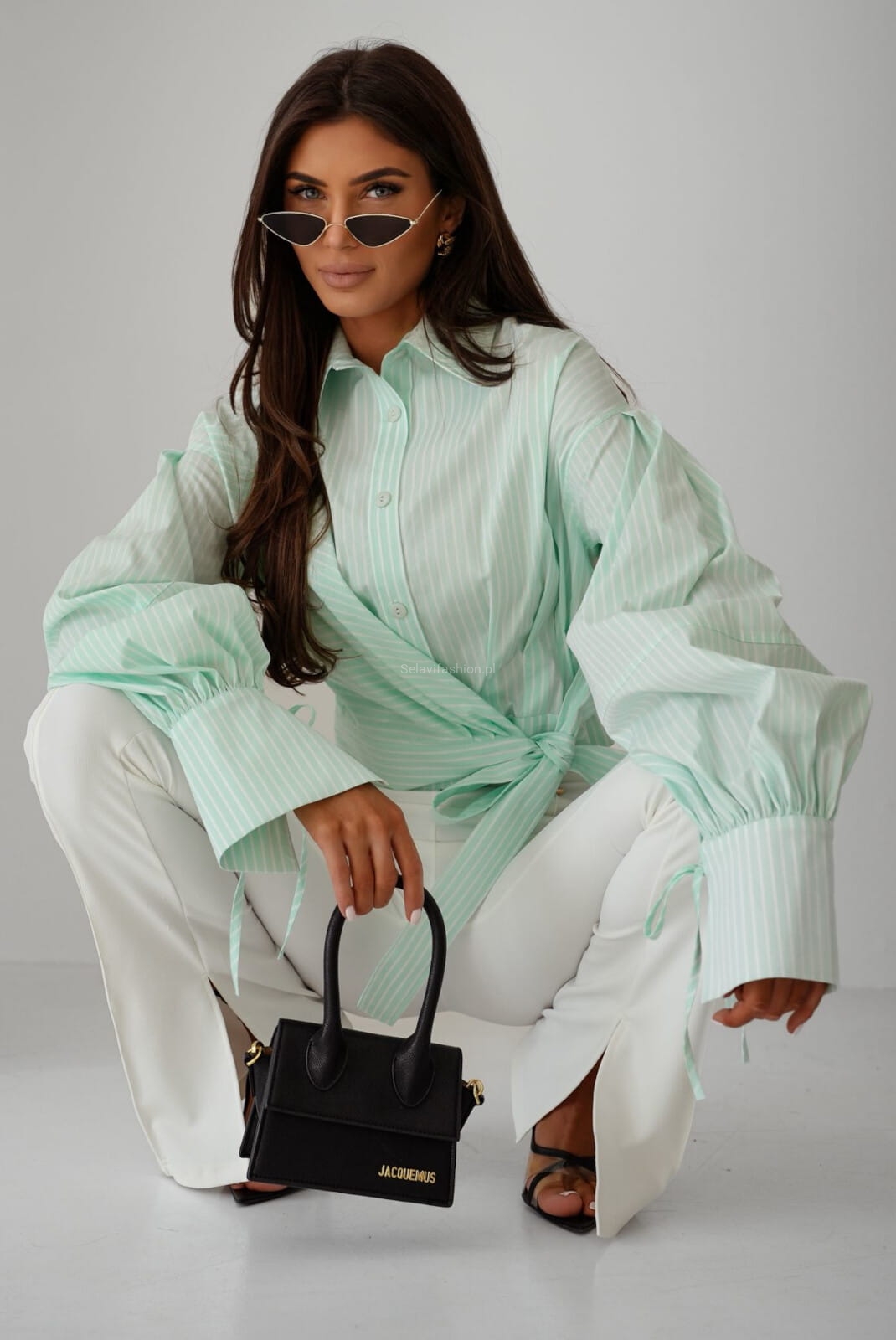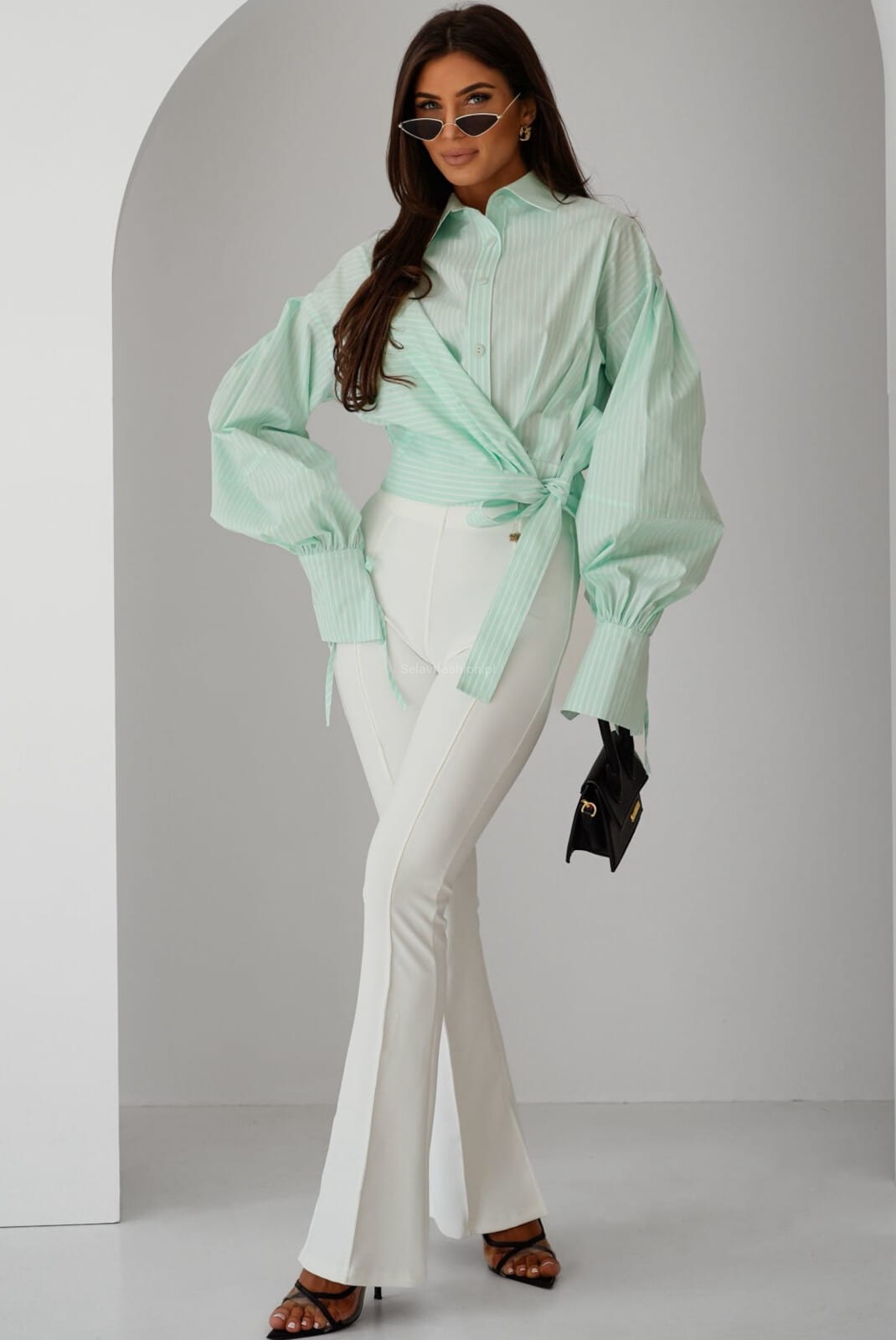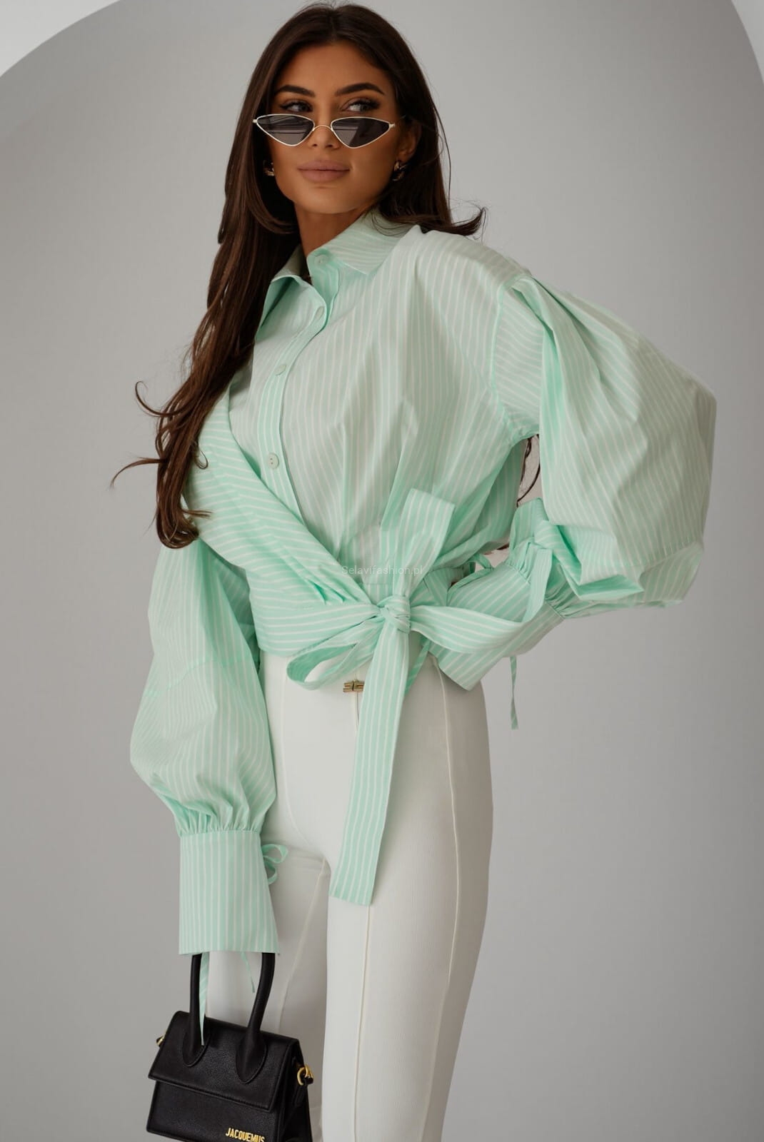Koszula Zimmer od Lavestino o kopertowym kroju, z wiązaniem w talii podkreślającym sylwetkę. Posiada klasyczny kołnierzyk, długie, bufiaste rękawy zakończone mankietami oraz ozdobne guziki. Model łączy elegancję z nowoczesnym, lekko oversize’owym fasonem.