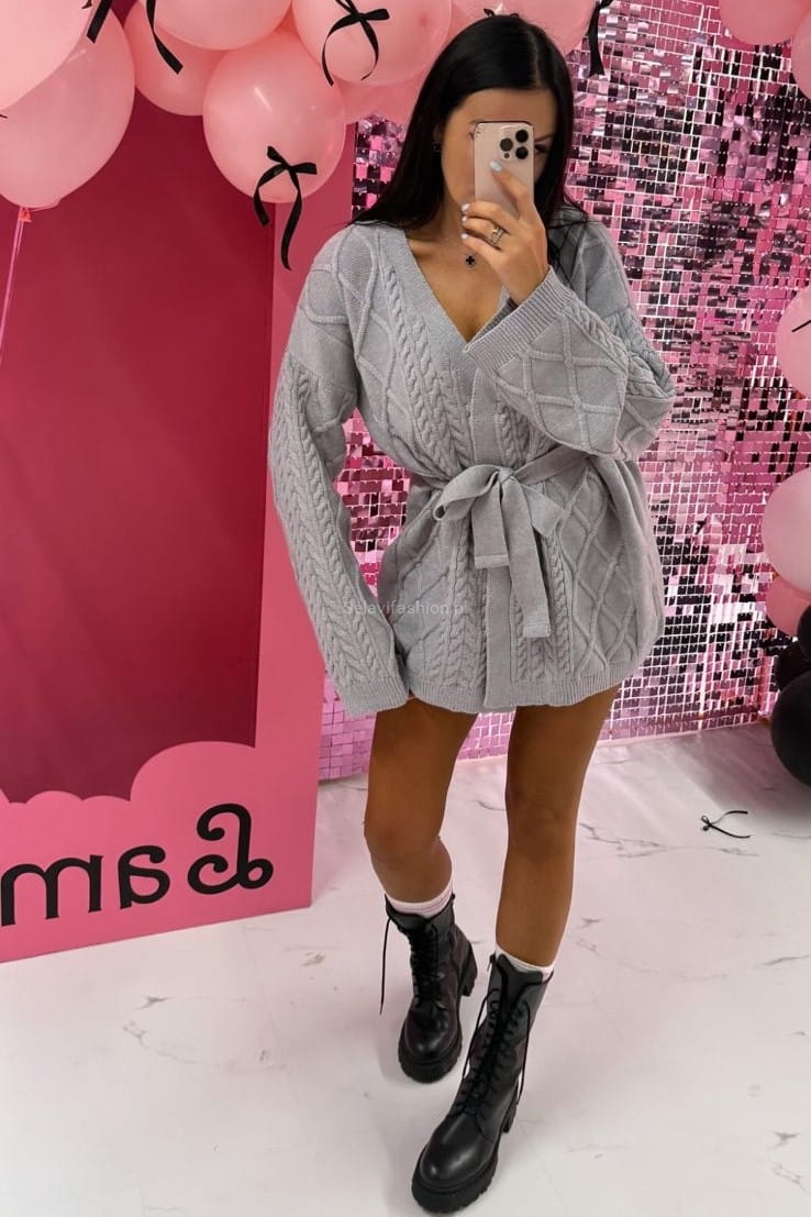 Wełniany, krótki kardigan od LaMilla z długim rękawem i paskiem. Dzianina posiada piękny geometryczny wzór zdobiący sweter.