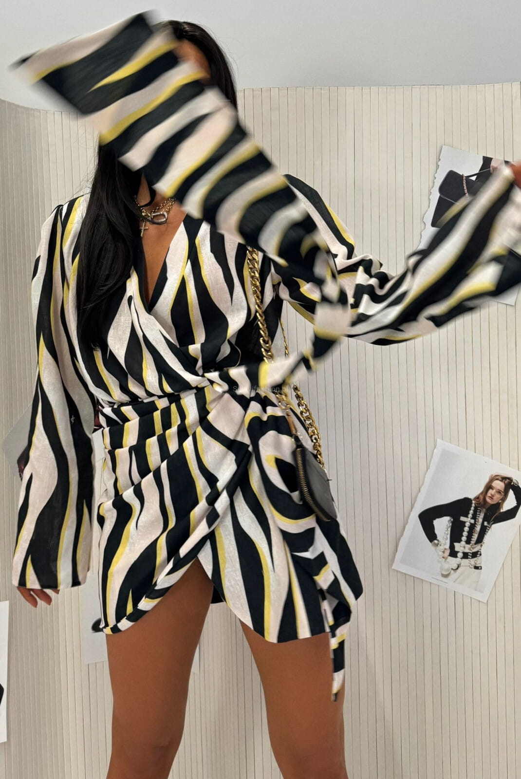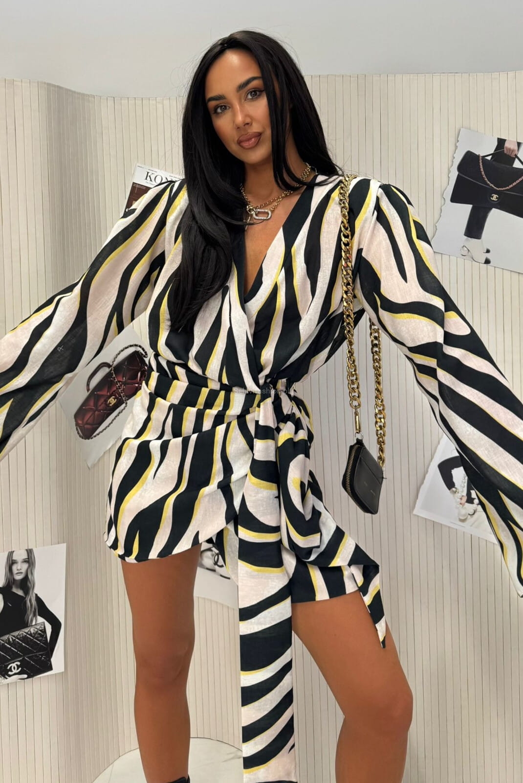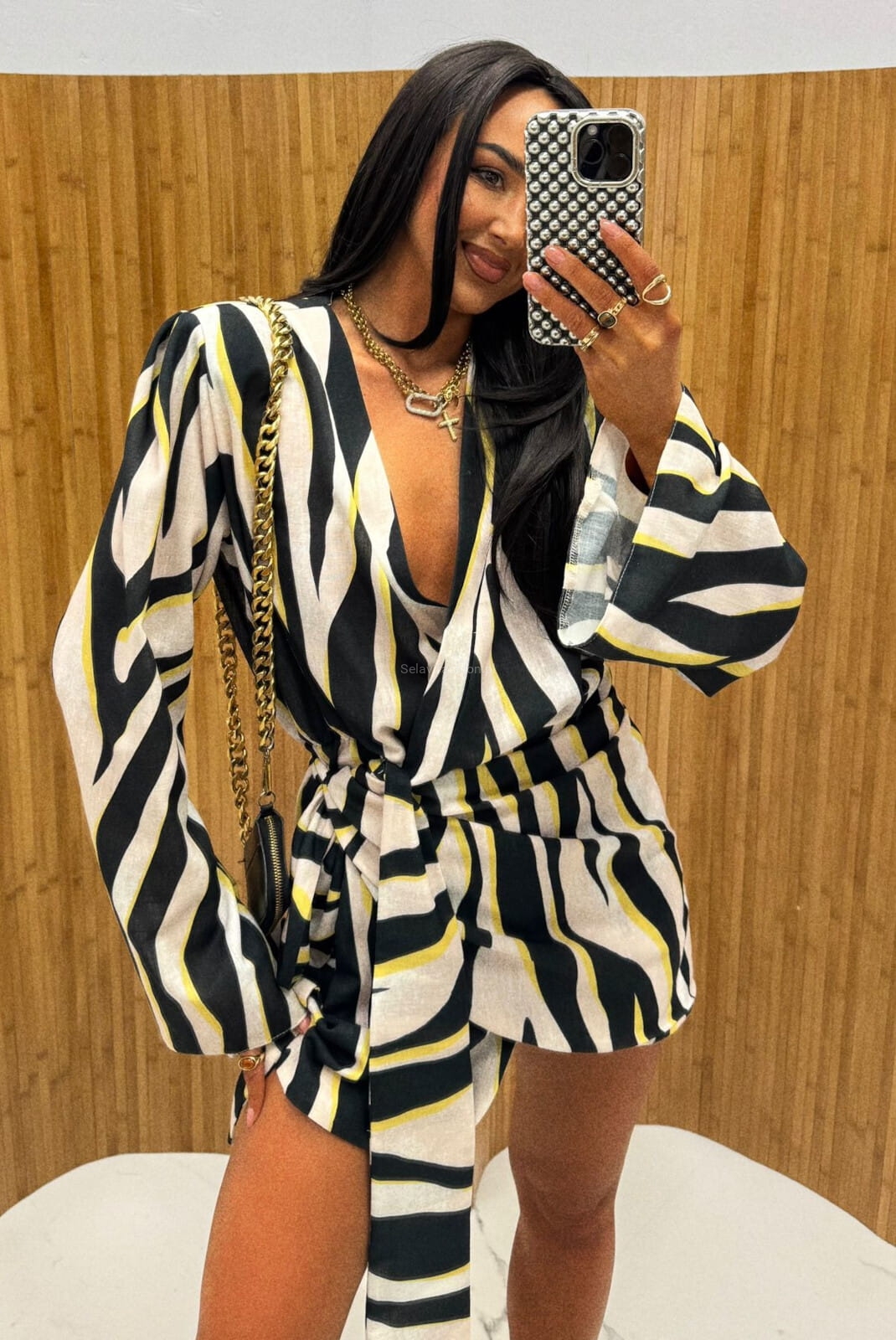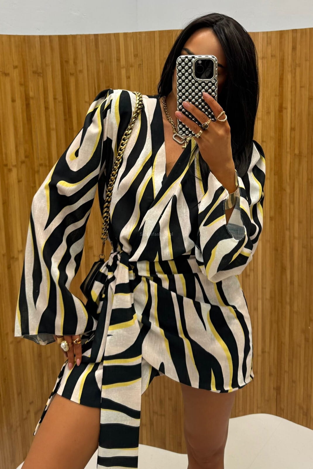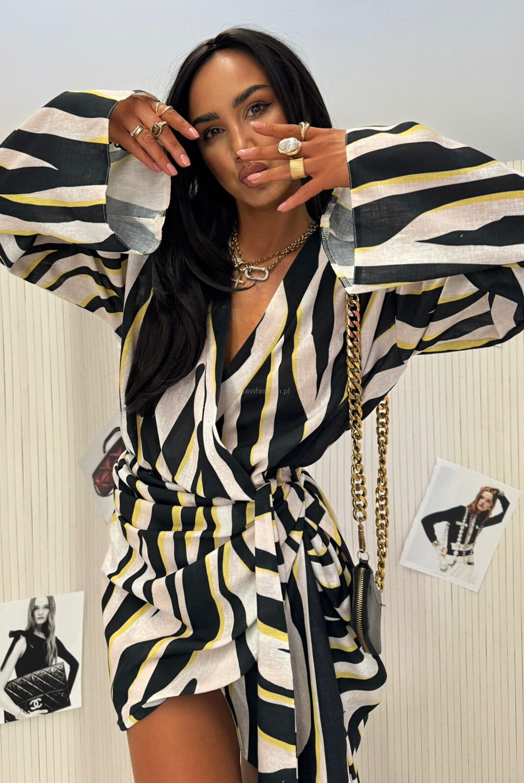 Lniana sukienka wiązana kopertowo Zebra LaMilla biała z żółtym