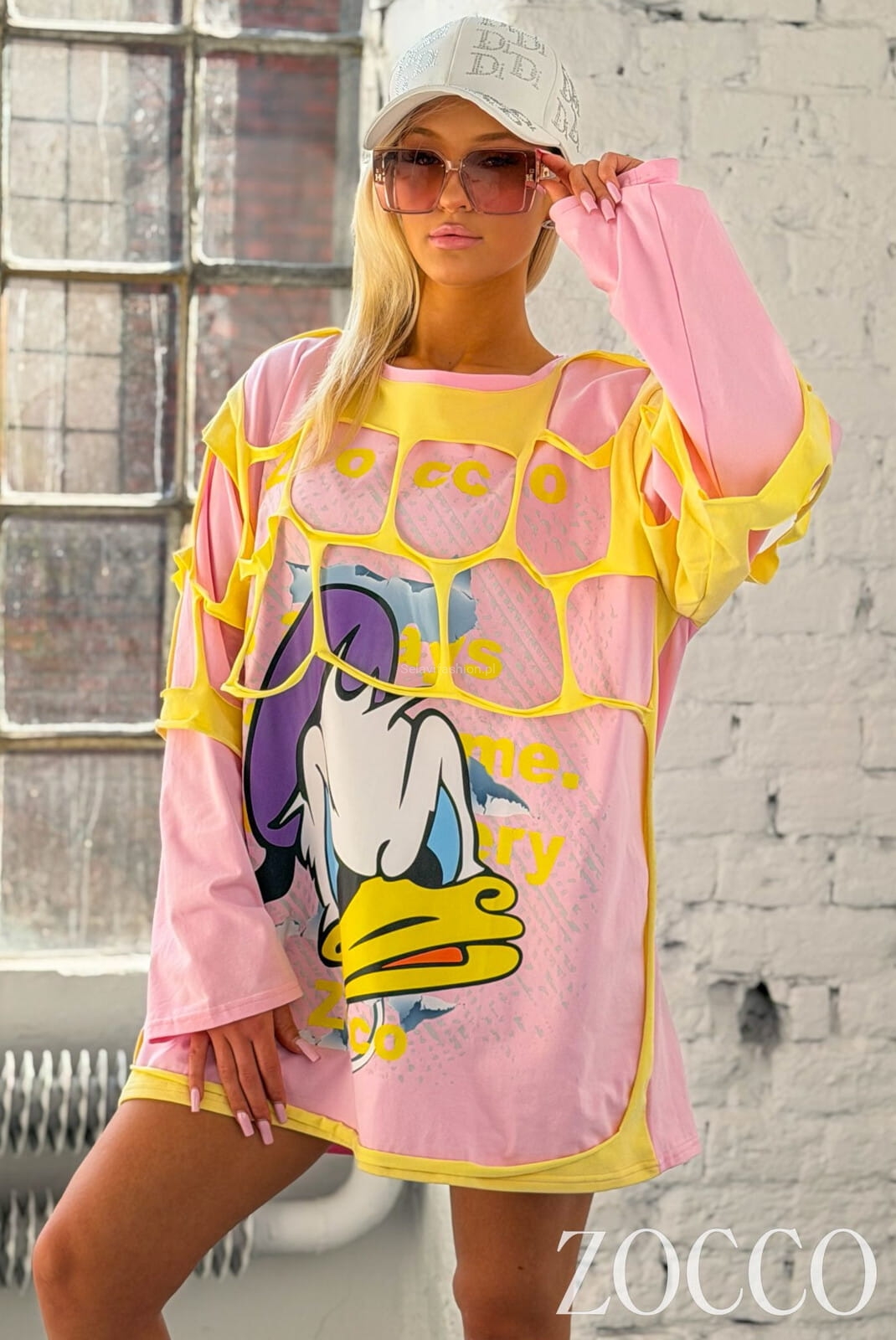 Obszerna dłuższa bluzka z nadrukiem DUCK Zocco różowa