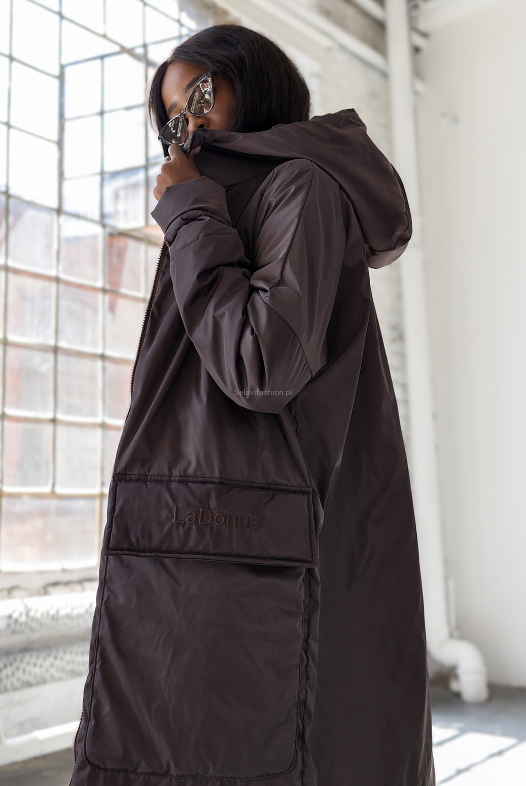 Długa kurtka polskiej marki La Donna to idealna propozycja na chłodniejsze dni. Model zapinany jest na praktyczny, podwójny suwak, co zapewnia swobodę ruchów. Kurtka posiada dwie klasyczne kieszenie ozdobione logo firmy oraz duży, obszerny kaptur, który chroni przed wiatrem i zimnem. To stylowa i funkcjonalna propozycja do jesienno-zimowych stylizacji, łącząca wygodę z elegancją.
