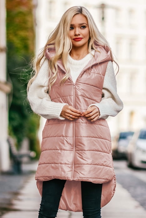 Długa, pikowana kamizelka z kapturem zapinana na suwak.