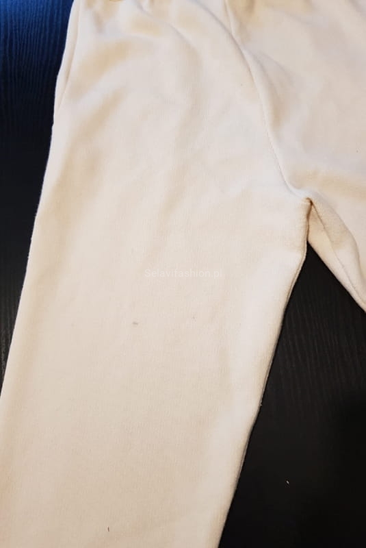 Spodnie dzianinowe, posiadają gumę w pasie oraz kieszenie. Spodnie są delikatnie brudne z tyłu na nogawce.