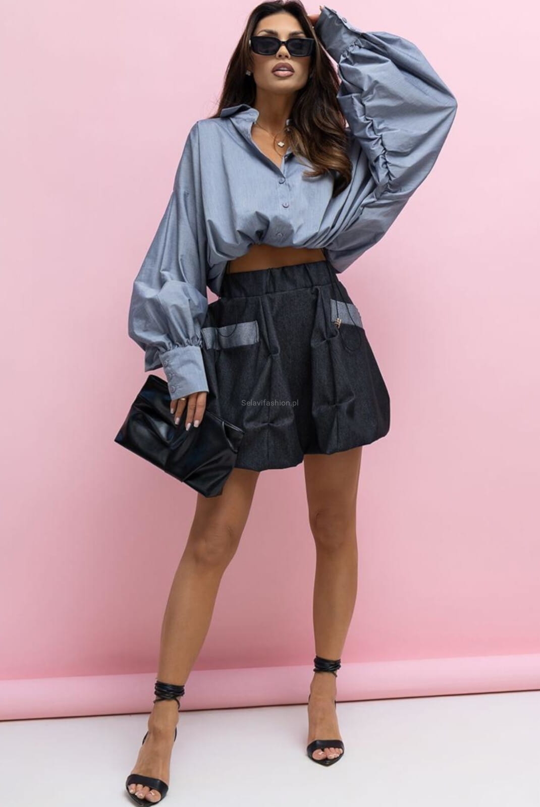 Spódniczka od Lavestino. Fason bombki, z marszczeniem z przodu i kontrastowymi patkami. Zapinany na suwak.