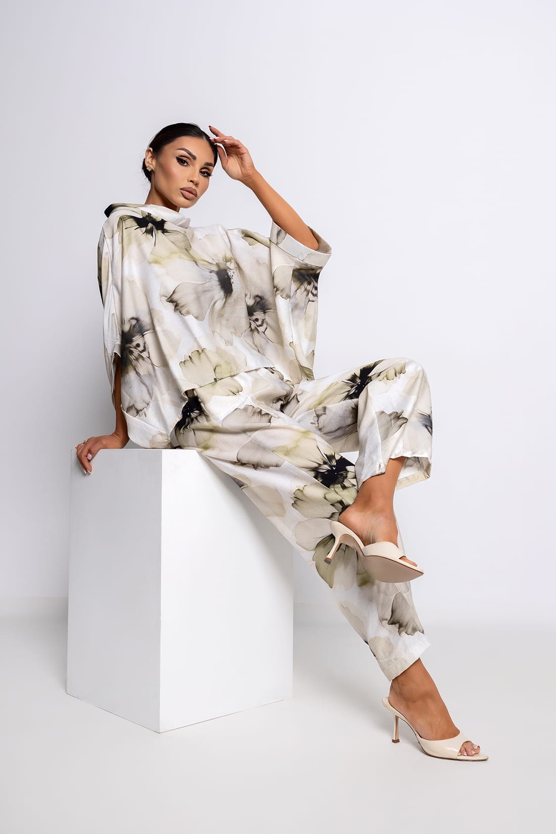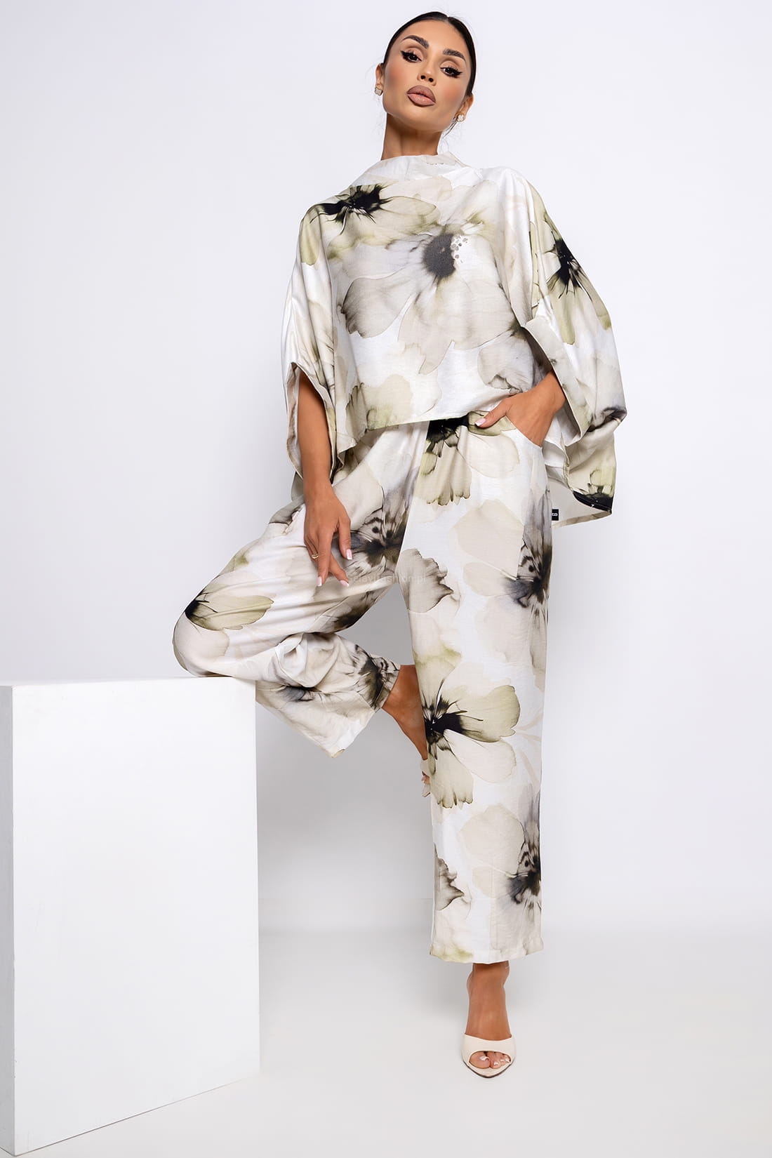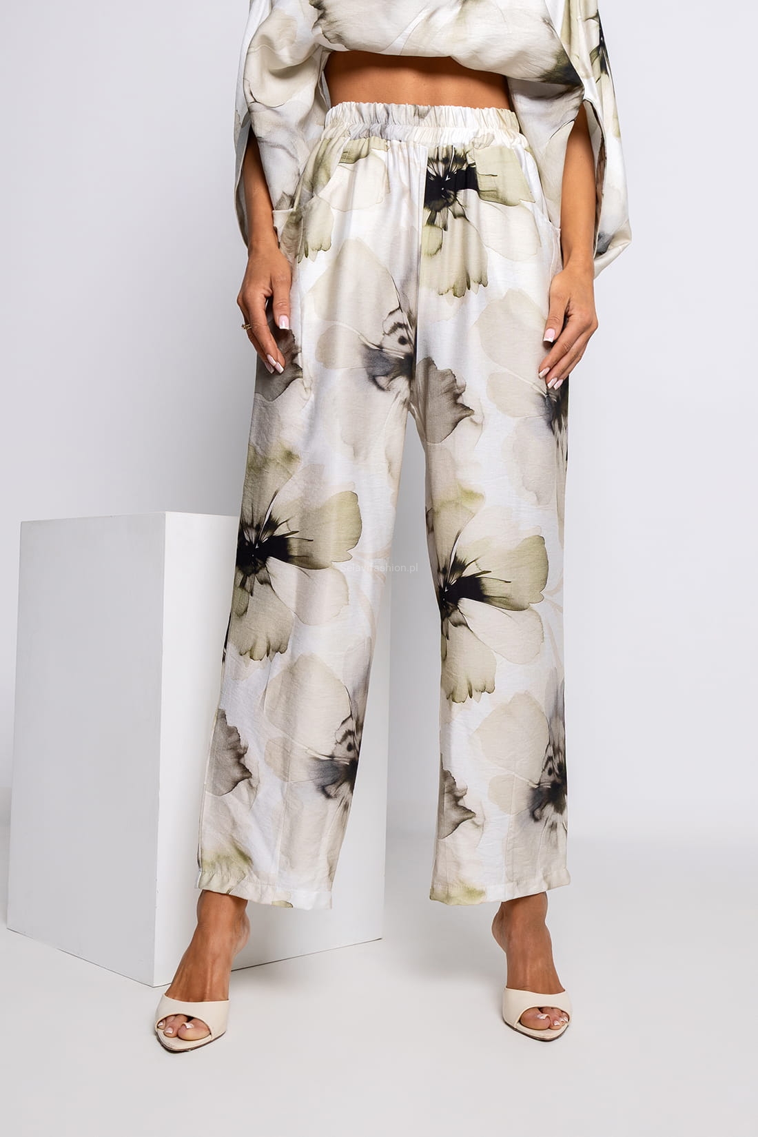 Charakteryzują się delikatnym, kwiatowym printem w odcieniach różu, beżu i subtelnych zieleni, który nadaje im romantycznego i świeżego wyglądu. Wysoki stan z elastyczną gumką w pasie doskonale dopasowuje się do sylwetki, podkreślając talię i zapewniając komfort.
