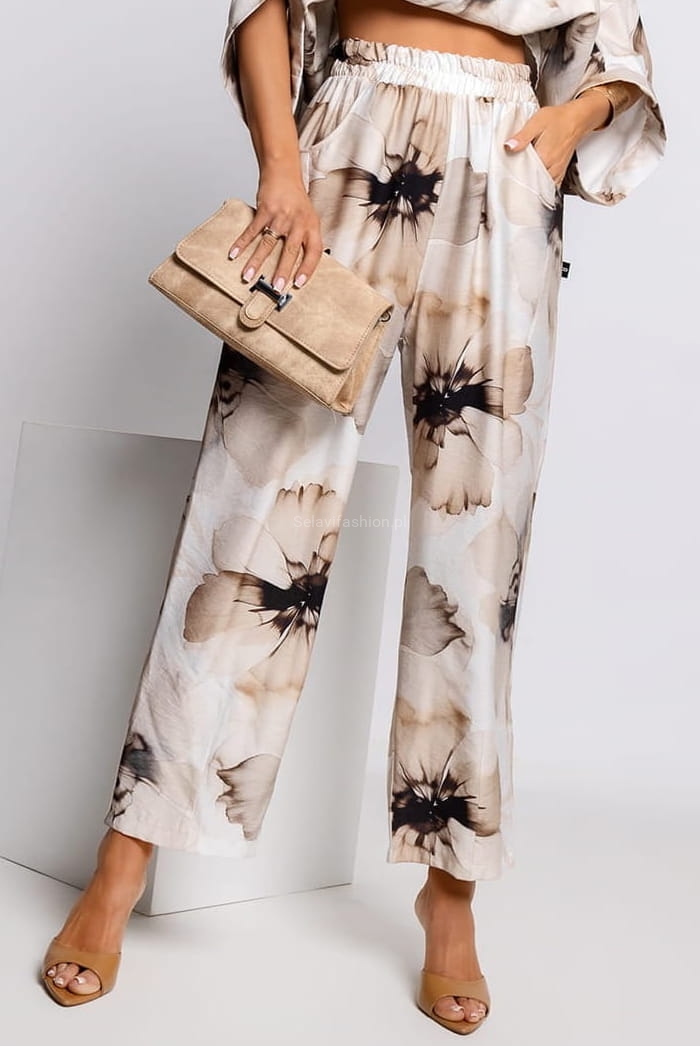 Charakteryzują się delikatnym, kwiatowym printem w odcieniach różu, beżu i subtelnych zieleni, który nadaje im romantycznego i świeżego wyglądu. Wysoki stan z elastyczną gumką w pasie doskonale dopasowuje się do sylwetki, podkreślając talię i zapewniając komfort.