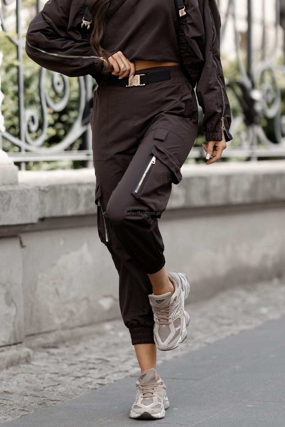 Spodnie bojówki z naszytymi kieszeniami typu kargo firmy Lavestino. Stylowe i praktyczne bojówki damskie z  klamrą w pasie. Wykonane z wytrzymałego materiału, idealne na co dzień. Posiadają pojemne kieszenie i luźniejszy krój zapewniający wygodę ruchu.