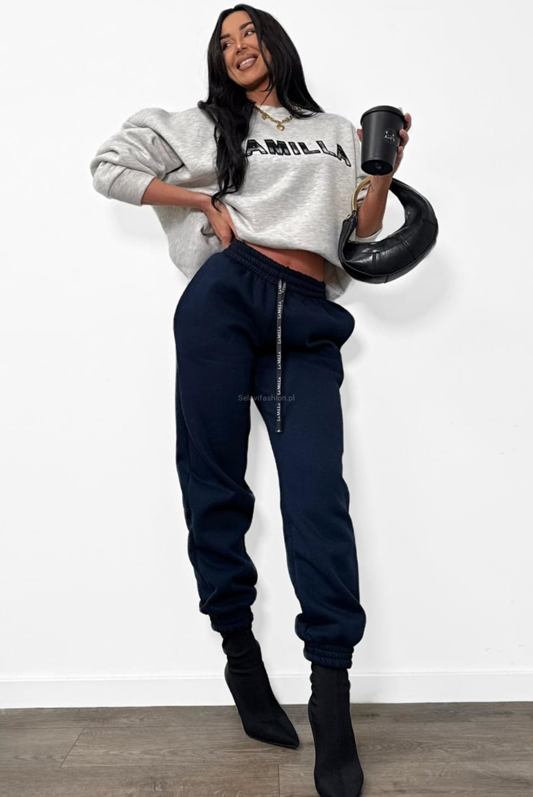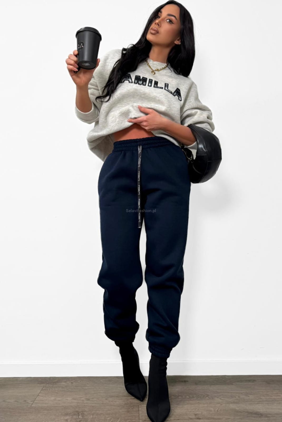 Dzianinowe spodnie firmy La Milla uszyte z elastycznego materiału bawełnianego. W pasie wszyta szeroka guma i logowany sznurek. Nogawki zakończone ściągaczem.