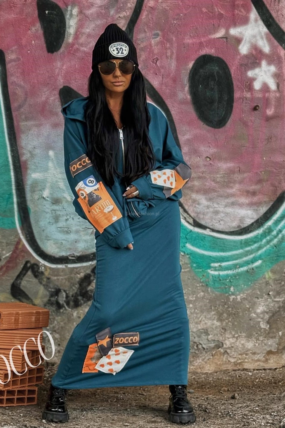 Komplet maksi od firmy Zocco składający się z bluzy na zamek, z kapturem i spódnicy na gumie z wiązaniem. Cały set uszyty z materiału bawełnianego, z kolorowymi naszywkami.
