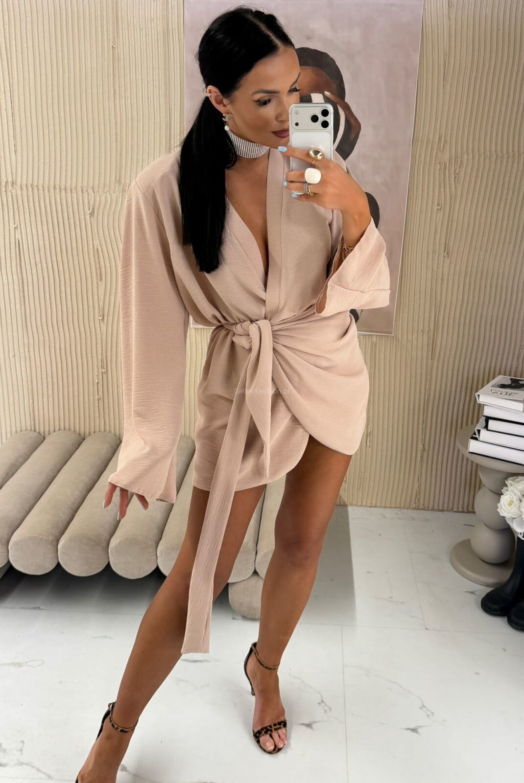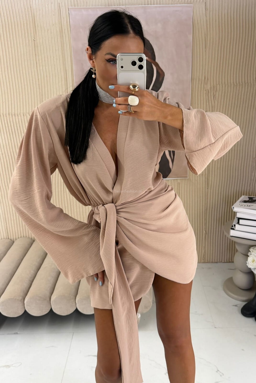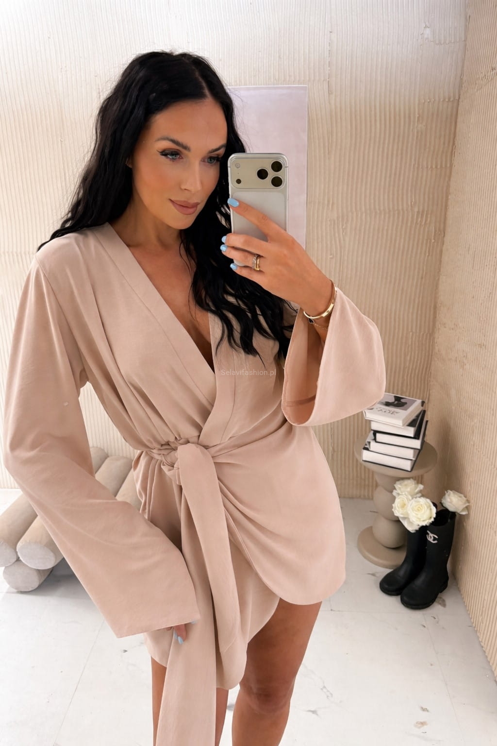 Sukienka polskiej firmy LaMilla. Fason kopertowy z innowacyjnym wiązaniem, gdzie część spódnicy łączy się z paskiem. W pasie wszyty dodatkowy sznurek podkreślający talię. Luźna oversiz'owa, w żywych pastelowych kolorach. Must have in sommer.