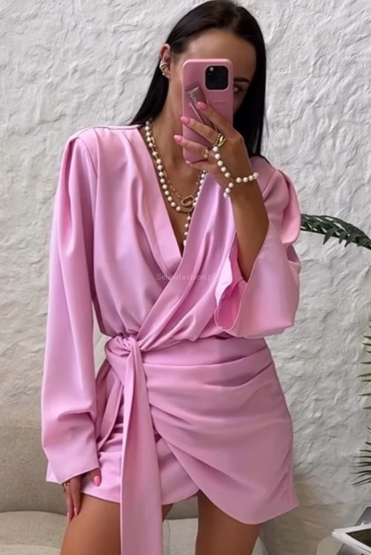 Sukienka polskiej firmy LaMilla. Fason kopertowy z innowacyjnym wiązaniem, gdzie część spódnicy łączy się z paskiem. W pasie wszyty dodatkowy sznurek podkreślający talię. Luźna oversiz'owa, w żywych pastelowych kolorach. Must have in sommer.