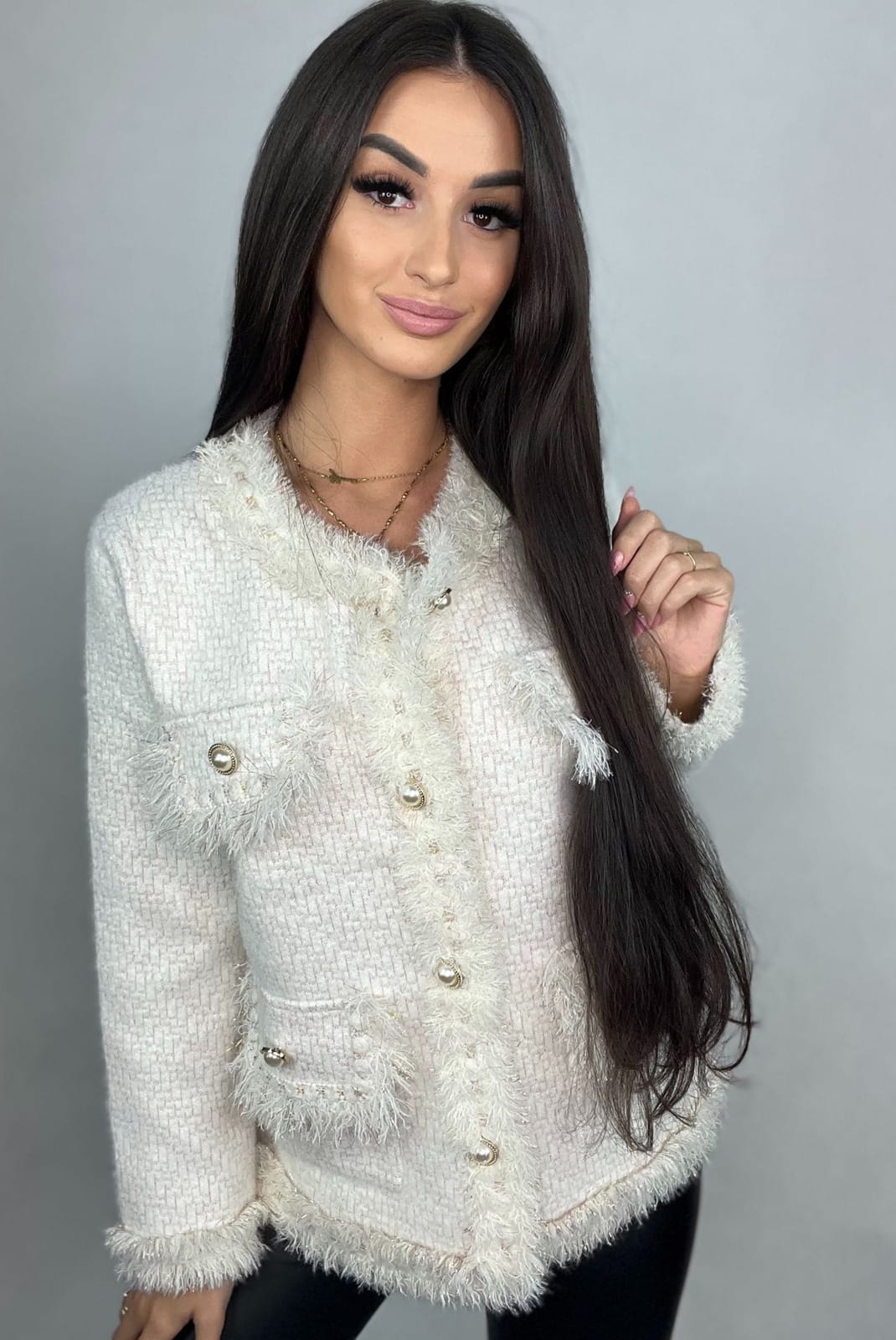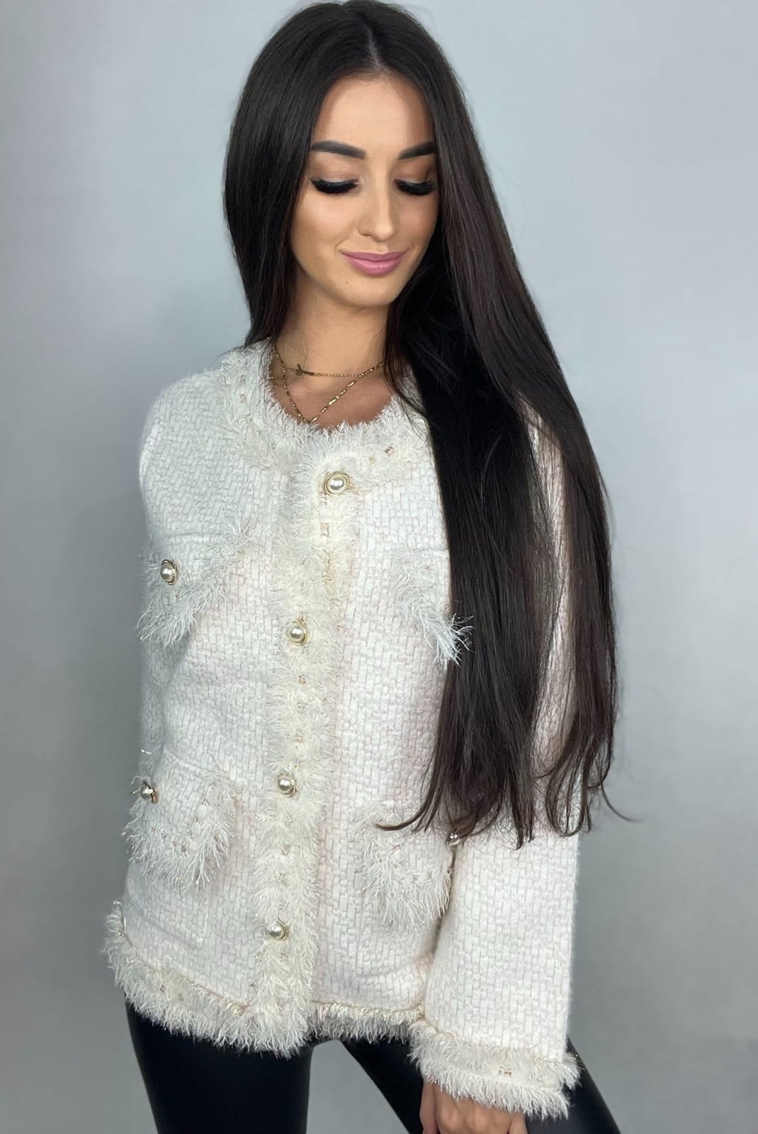 Sweter marynarka z błyszczącą nitką zapinany na ozdobne guziki Minouu biały