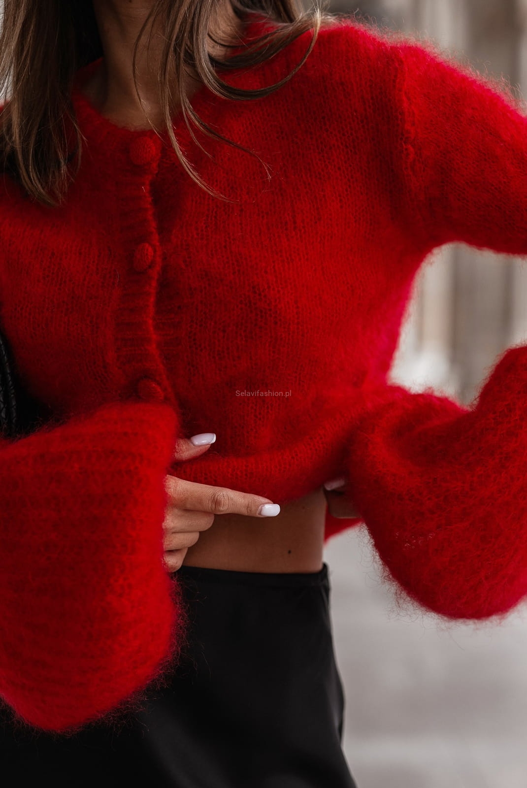 Sweter moherowy z szerokimi mankietami zapinany na guziki Yarn czerwony